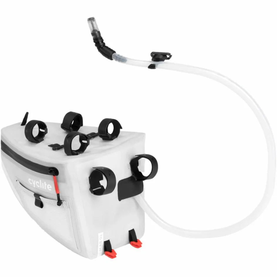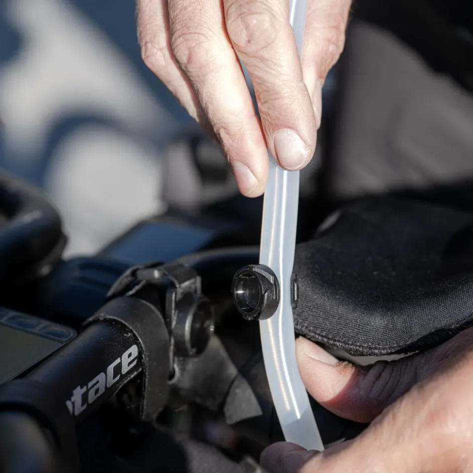 Die Aero Bladder / 02 hast du, im übertragenen und im Wortsinn, direkt vor der Nase: Sie ist höchst einfach zu errreichen und dazu noch dank ihrer Platzierung in der Handle Bar Aero Bag sehr aerodynamisch. Damit ist das Trinken während der Fahrt ein Kinderspiel.