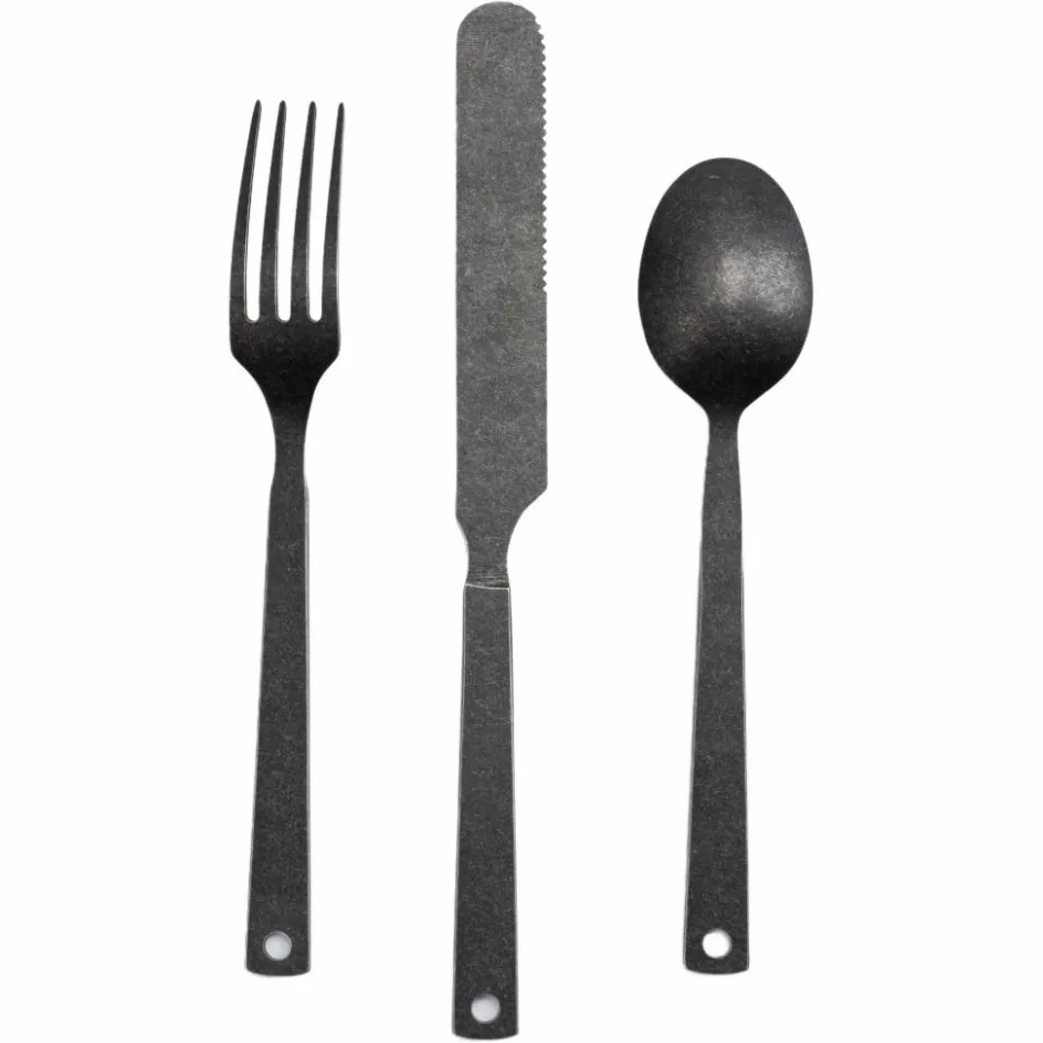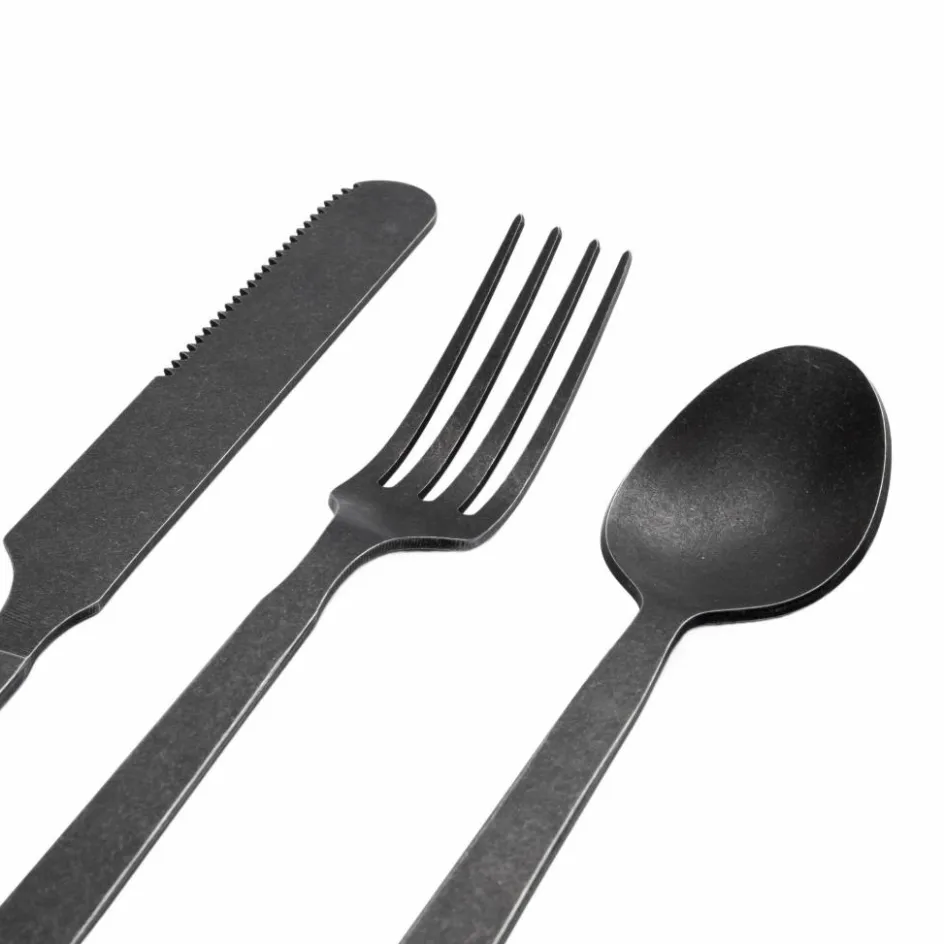Dieses antik anmutende Besteck-Set besteht aus je zwei Löffeln, Gabeln und Messer. Der rostfreie Stahl ist getrommelt, was dem Set ein rustikales Finish verleiht.