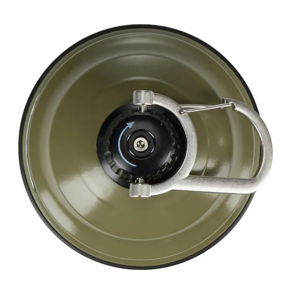 Handgroße Campinglaterne mit stufenloser Dimmfunktion von 30 bis 220 Lumen und einem Lampenschirm aus stoßfestem Stahl. Die Linse besteht aus Polycarbonat und bildet am Fuß eine Standfläche.