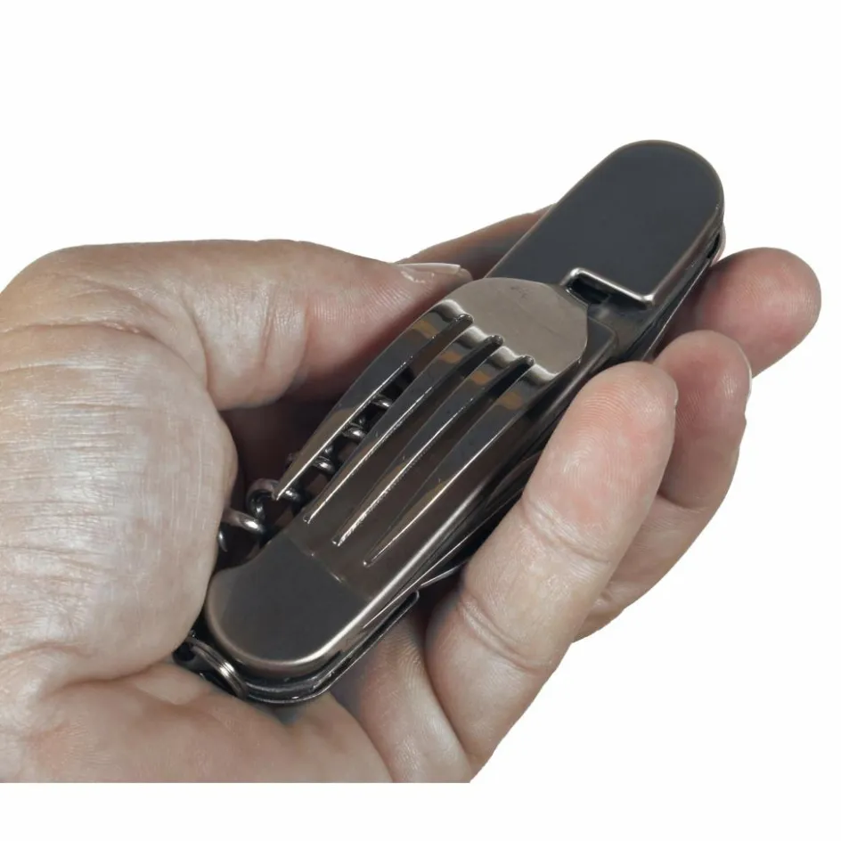 Set aus Messer, Löffel, Gabel, Dosenöffner, Korkenzieher und Ahle. Die beiden Schalen lassen sich entriegeln und so in Messer, Löffel und Ahle auf der einen, den Rest auf der anderen Seite teilen.