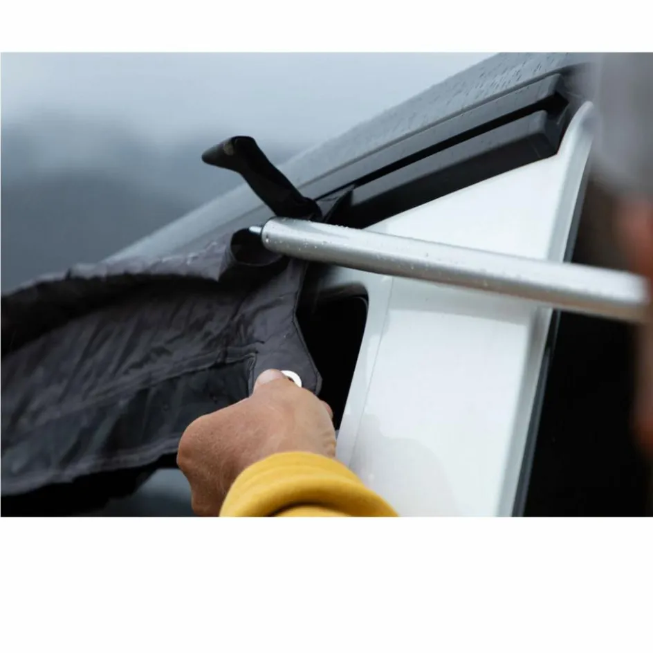 So abgespannt, kann der Universal Fahrzeugadapter mittels Klemmen oder Saugnäpfen (nicht enthalten) an Fahrzeugen ohne Kederschiene montiert werden.