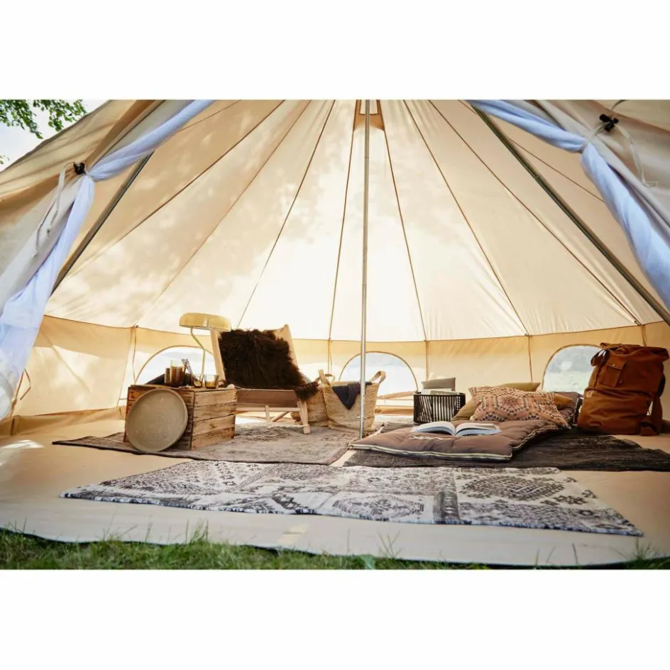 Sehr großes Baumwollzelt mit Glockenkonstruktion und Platz zum Schlafen für bis zu 6 Personen. Es bietet beste Belüftung und ein angenehmes Wohnraumklima.