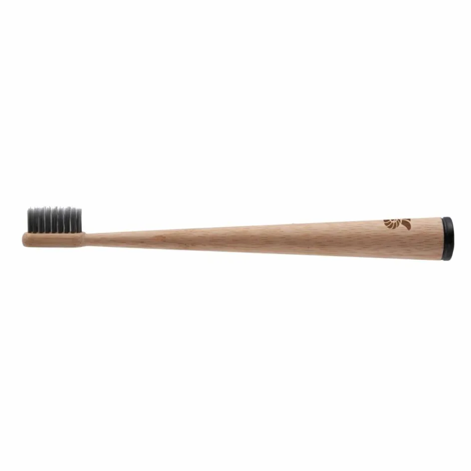 Bambuszahnbürste mit Borsten aus Bambus–Viskose. Durch die Kegelform kann die Zahnbürste zum Trocknen aufrecht hingestellt werden. Inkl. Reiseetui aus Bambus.