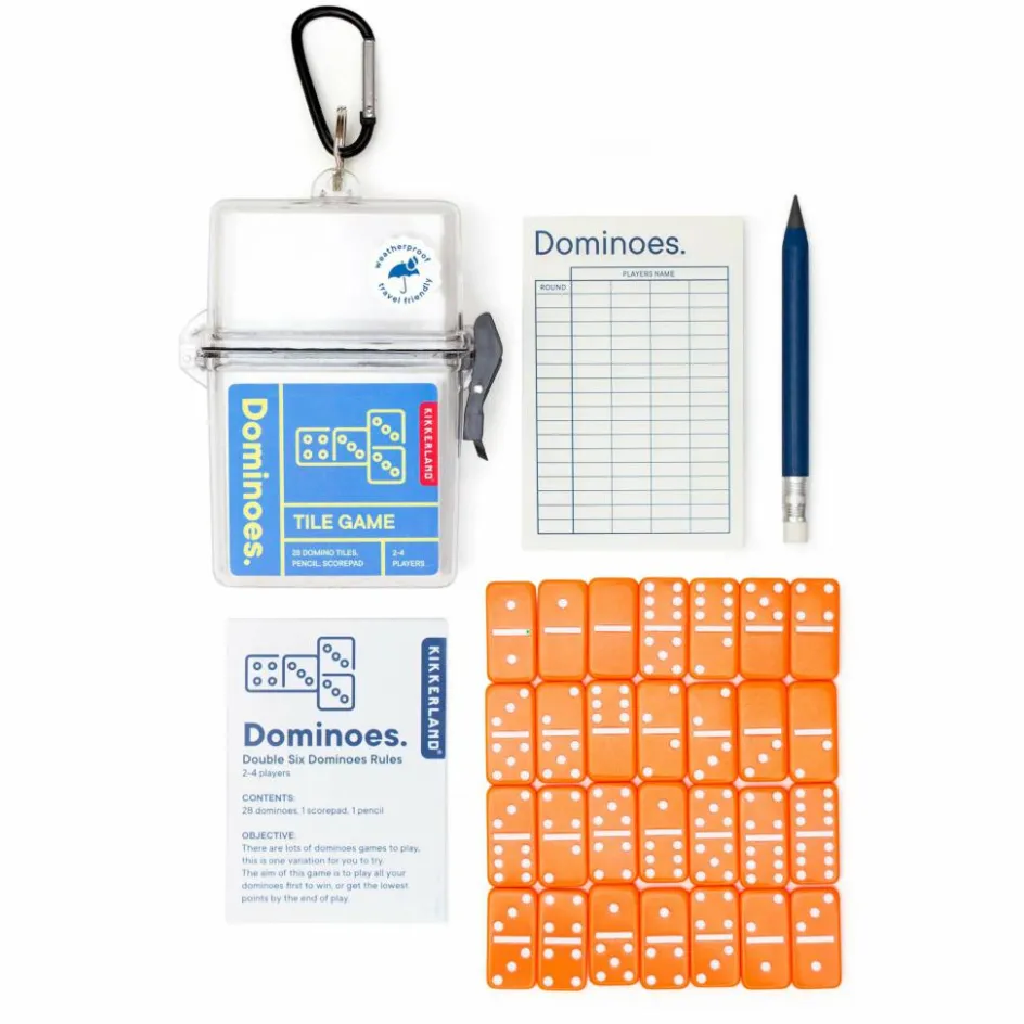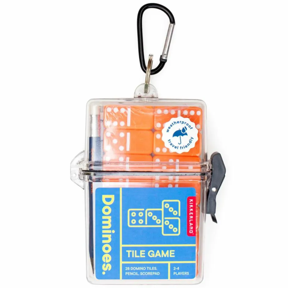 Domino für unterwegs: Ob vorm Zelt oder in der Bahn, mit den Dominoes ist immer eine Partie möglich. Praktisch: Alle Utensilien fürs Spiel kommen in einer wasserdichten Box mit Karabiner.