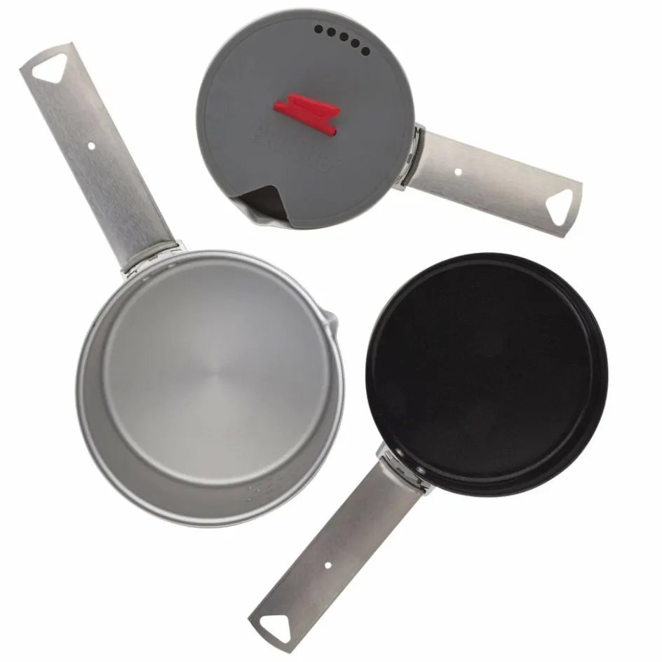 Kleines Kochset für eine Person. Bestehend aus zwei Töpfen mit 0,6 l und 1 Liter Volumen, Pfanne und Deckel mit integriertem Sieb. Die Griffe können zum Transport platzsparend verstaut werden.