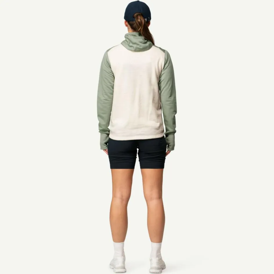 Das Außenmaterial der Jacke besteht aus einem Mix aus Merinowolle und Polyamid. Durch die Kunstfaser ist das Gewebe widerstandsfähiger, was beim Tragen eines Rucksacks von Vorteil ist. Zudem wurde die Außenseite mit Aquaduct behandelt. Aquaduct ist eine stark feuchtigkeitsleitende Ausrüstung, die eine ähnliche Wirkung wie ein absorbierender Docht hat. Dadurch kann entstehende Körperfeuchtigkeit noch schneller nach außen transportiert werden.