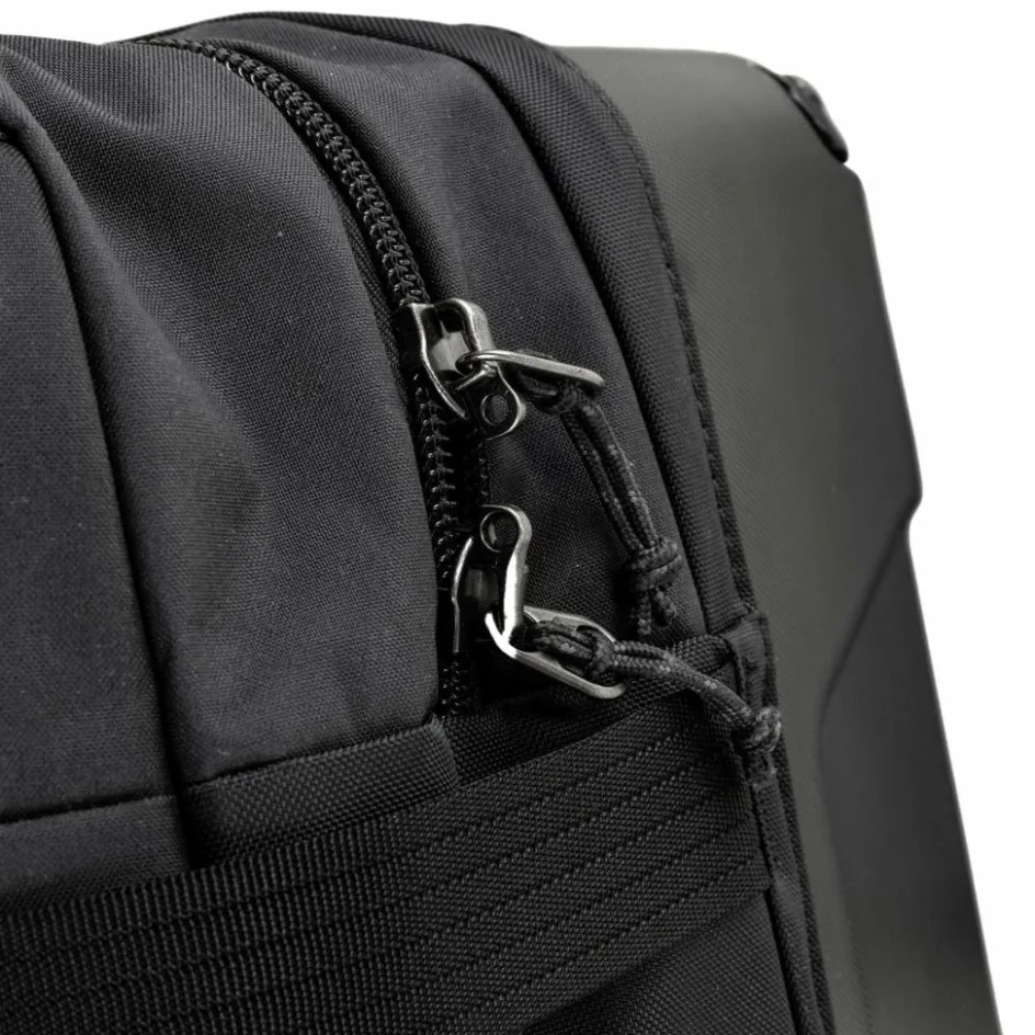 Damit der Inhalt an Ort und Stelle bleibt, sind beide Kofferhälften mit einer Netzabdeckung ausgestattet. Die untere Hälfte besitzt zusätzlich einen Kompressionsriemen. Auf der Front befindet sich ein leicht gepolstertes Fach, beispielsweise für einen Laptop oder Unterlagen. Ist der Trolley nicht vollbepackt, kannst du ihn mithilfe der äußeren Kompressionsgurte komprimieren.