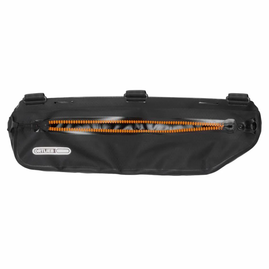 Lange Tasche zur Befestigung am Oberrohr. Mit 4 Litern Volumen bietet die wasserdichte Tasche genügend Platz für Ausrüstung wie Kleidung, Snacks, Kocher und andere Ausrüstung.