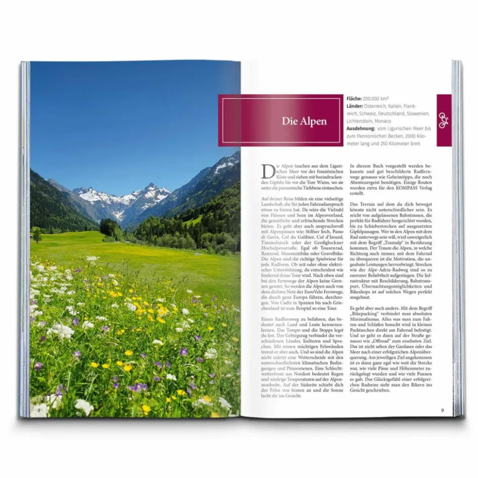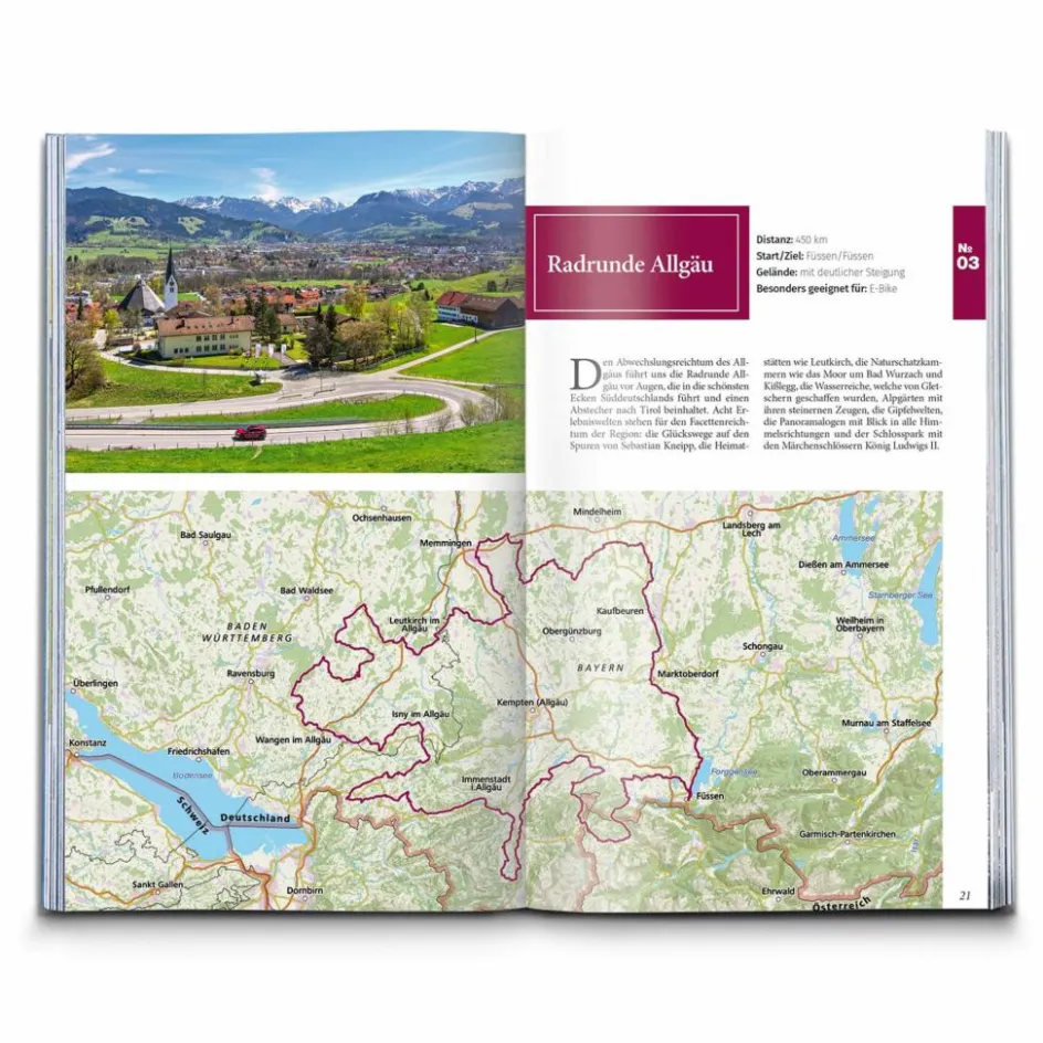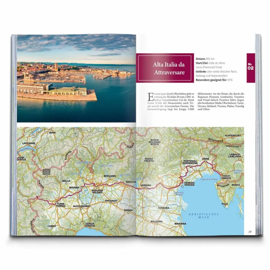 Vorgestellt werden Klassiker wie der Via Claudia Augusta, der Bodenseeradweg oder Alpe-Adria Radweg. Dazu kommen alle Abschnitte des Eurovelo-Netzes in den Alpen und die Schweizer Fernradwege. Als besondere Highlights gibt es noch eigens erstelle Radtouren für Entdecker wie die Route Bregenz Nizza.
