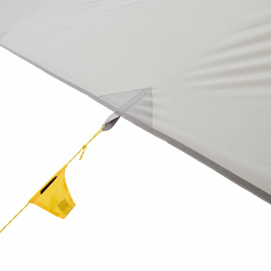 Sehr großes Tarp mit 17,4 m² Fläche, unter dem es sich geschützt vor Sonne und Regen mit der ganzen Familie sitzen lässt. 16 Abspannpunkte ermöglichen eine Vielzahl an Aufstellvarianten.