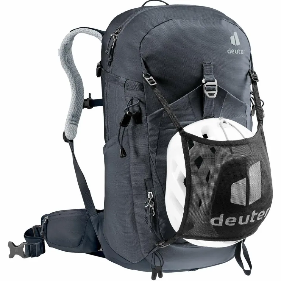 Das Airstripes Rückensystem mit geringer Auflagefläche und luftdurchlässigem, schnell trocknendem Air Spacer Mesh sorgt zusammen mit den perforierten Schulterträgern und Hüftflossen für maximale Belüftung, gute Lastverteilung und kompakten Sitz auf Mehrtagestouren mit Klettersteig. Dank Fixierungen an den Schulterträgern sind die Karabiner des Klettersteigsets stets griffbereit und das Material durch den großen Reißverschluss-Hauptfachzugang, die elastischen Seitentaschen und das separate Bodenfach gut sortiert und schnell verräumt.