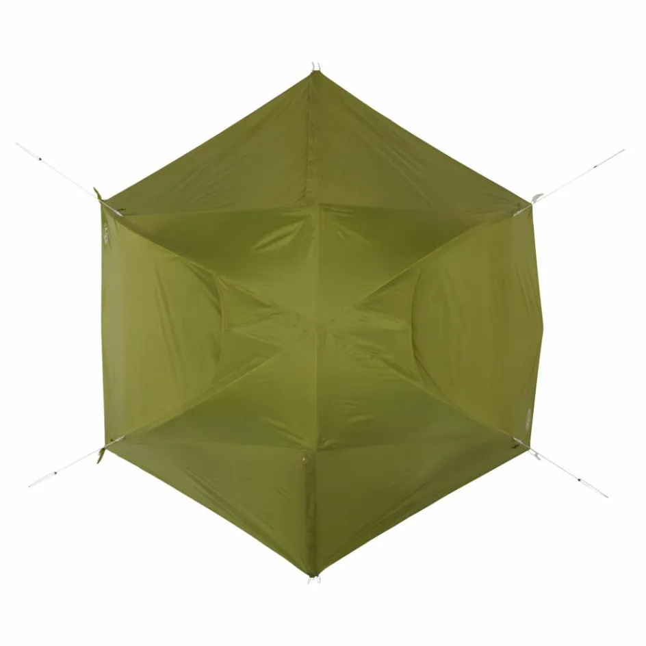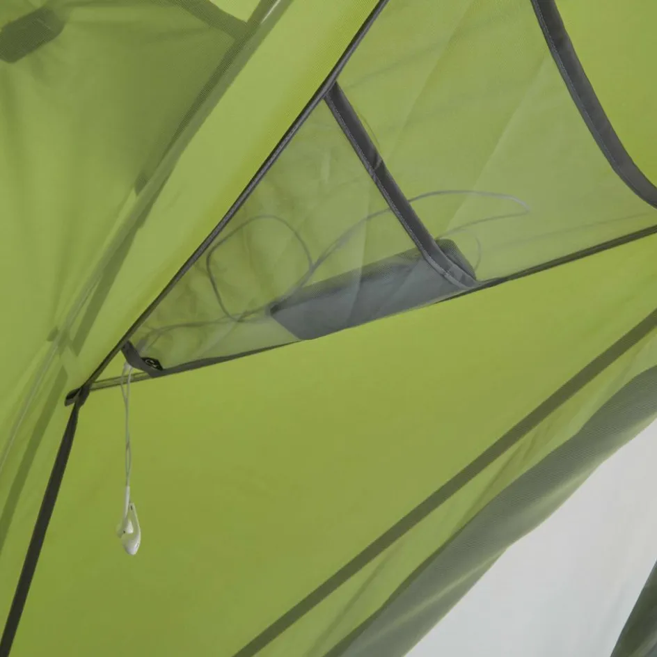 In den beiden Apsiden kannst du das Gepäck lagern, während du im Innenzelt genügend Platz für zwei Isomatten hast. Das weit aufgespannte Innenzelt schafft im Kopfbereich viel Bewegungsfreiheit, was ein gemütliches Beisammensitzen am Abend ermöglicht. Um in der Nacht die Stirnlampe oder Brille schnell zu finden, verfügt das Innenzelt über zwei Seiten- und vier Deckentaschen (zwei davon mit Kabeldurchführung).