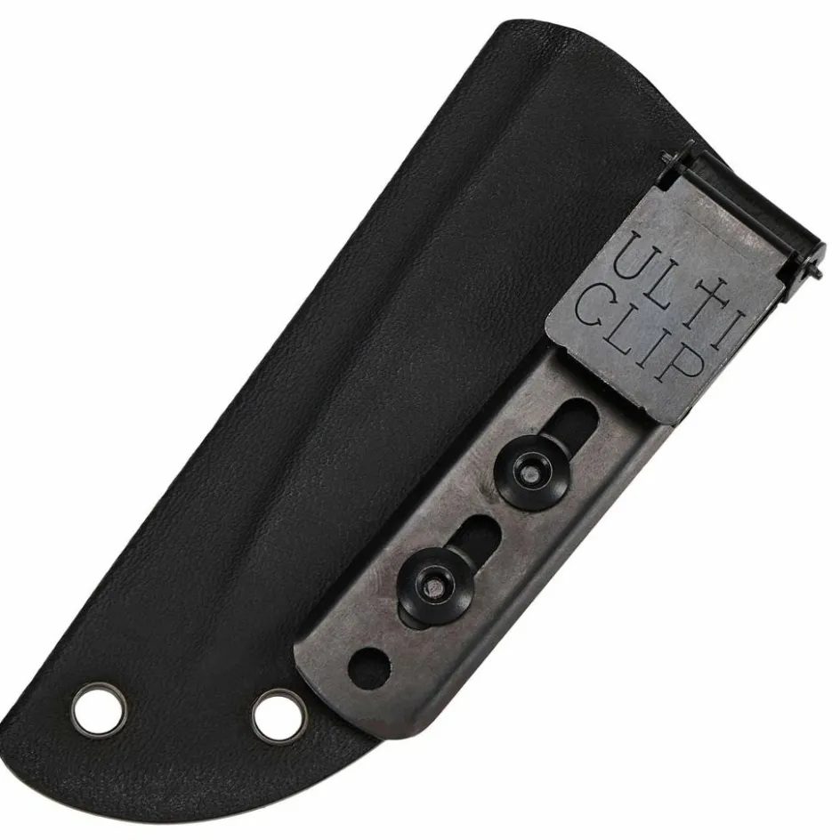 Das Messer wird in der Kydexscheide verstaut, die mit einem Ulticlip ausgestattet ist. Diese Federklammer ermöglicht einen tiefen Sitz in der Hosentasche, wobei der Griff des Messers aus der Tasche herausragt. Der Ulticlip kann sowohl an der rechten als auch an der linken Seite der Scheide befestigt werden und ist mit einer Spannvorrichtung versehen, die eine feste Befestigung an der Tasche ermöglicht. Dies erlaubt das Ziehen des Messers, ohne dass die Scheide aus der Tasche gezogen wird.