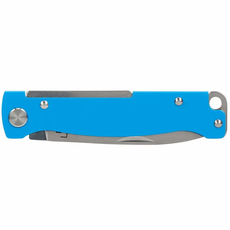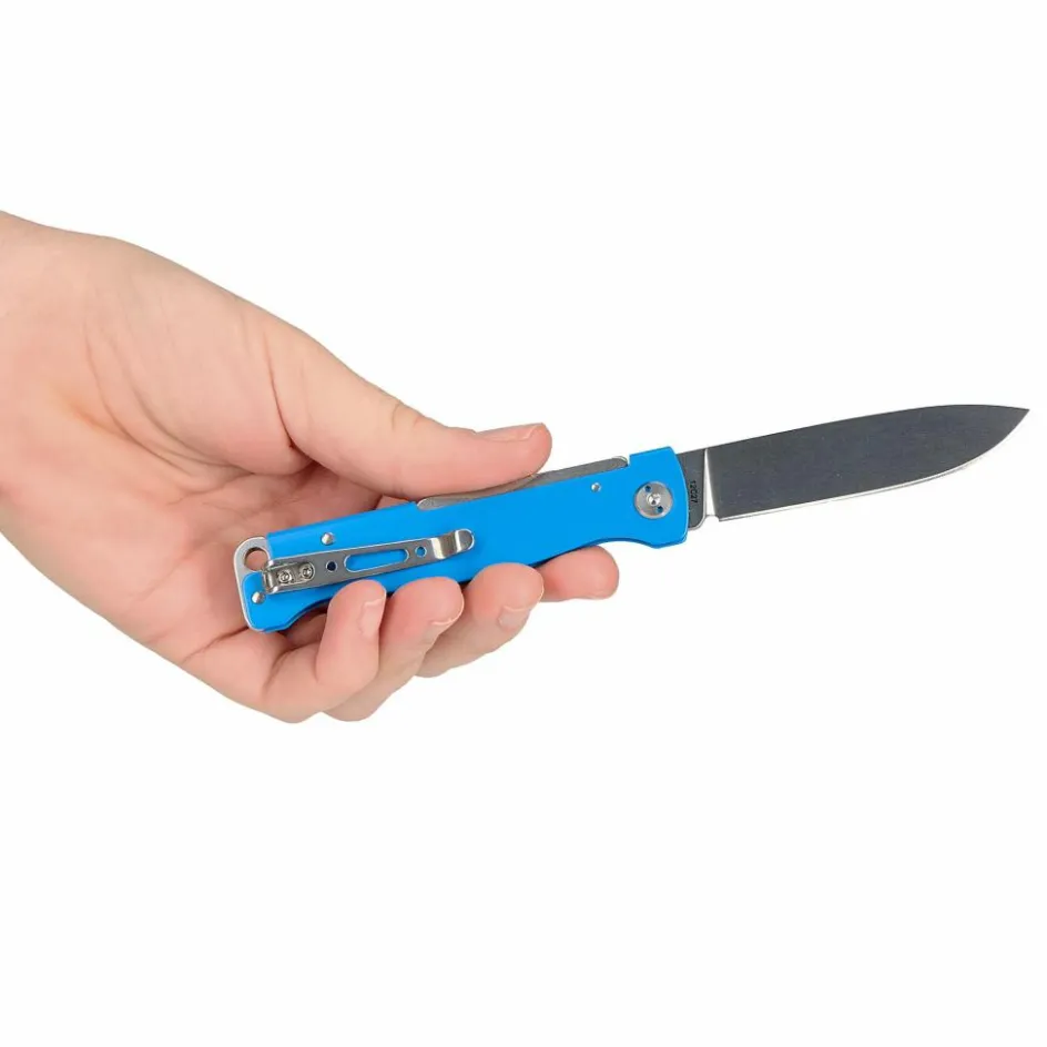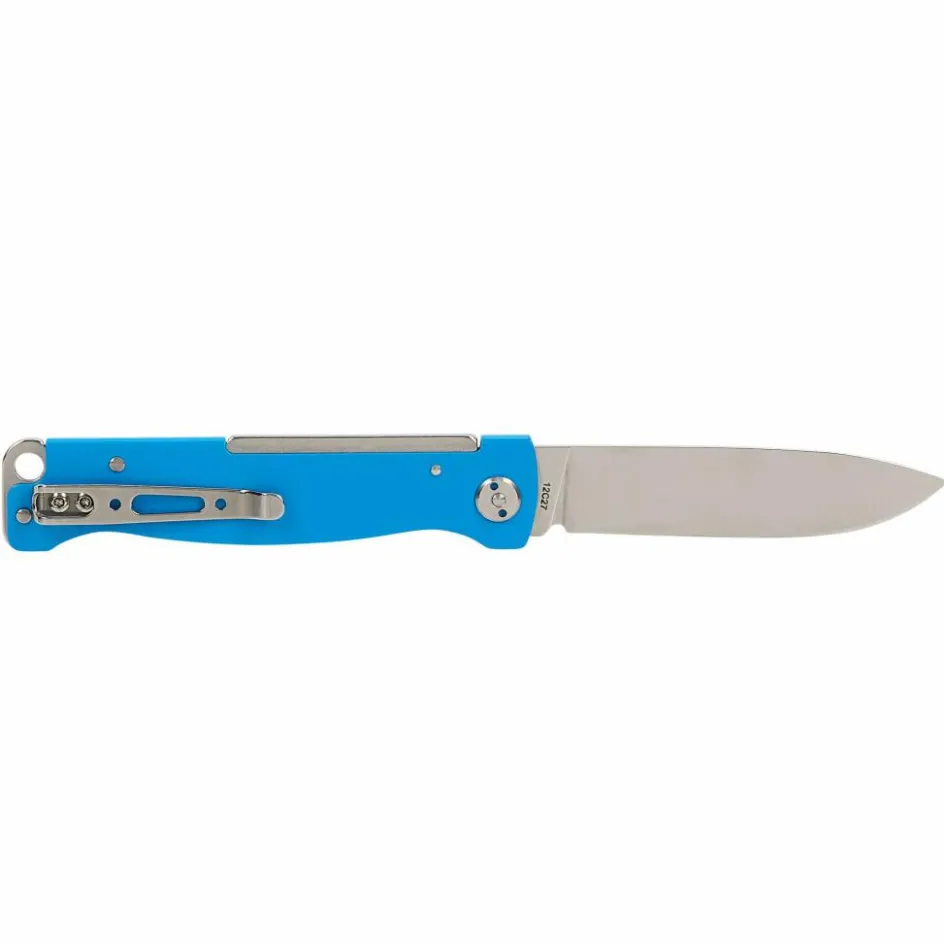 Das Atlas Blue verschwindet mit seiner 5 mm starken Bauweise nahezu unmerklich in der Hosentasche. Der blaue Edelstahlgriff bringt Farbe in den Alltag und ergänzt die polierte Klinge aus 12C27-Stahl.