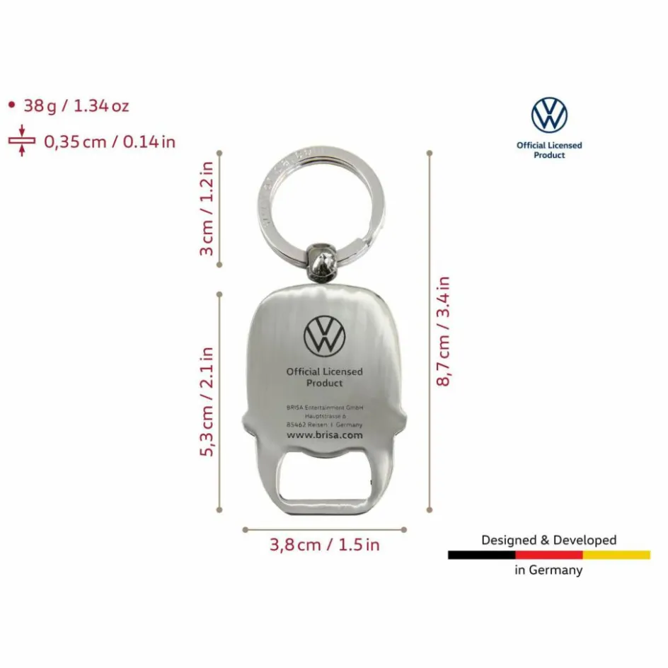 Dieser Schlüsselanhänger lässt Bulli-Fans höher schlagen und ist definitiv ein Blickfang am Schlüsselbund. Das T1-Modell ist mit einem Schlüsselring und Flaschenöffner ausgestattet.