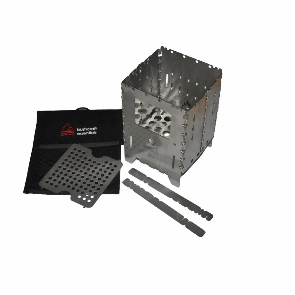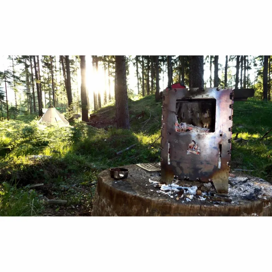 Als Brennstoff können Äste und Kiefernzapfen, aber auch ein Spiritusbrenner oder Esbitwürfel dienen. Dadurch bist du fast überall unabhängig unterwegs. Das Universalrost kann mittig eingesetzt werden, wodurch du die Bushbox auch mit einem Trangiabrenner betreiben kannst. Oben aufgelegt dient das Universalrost als Grillplatte.