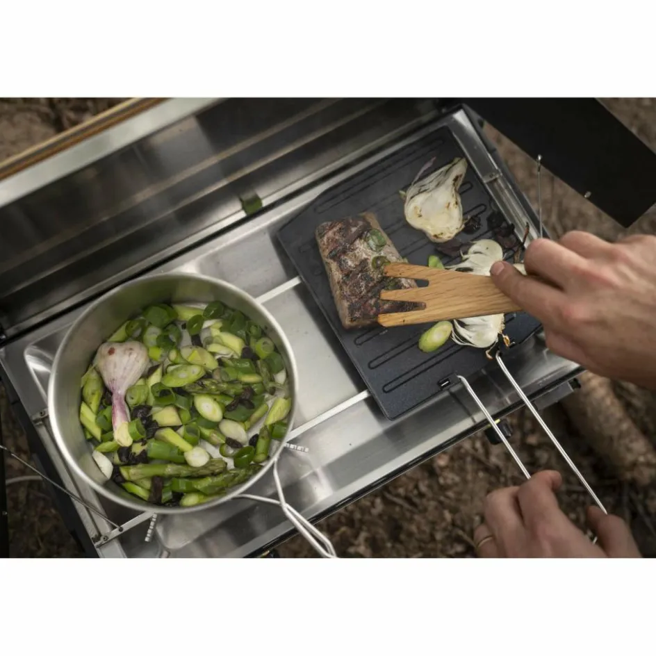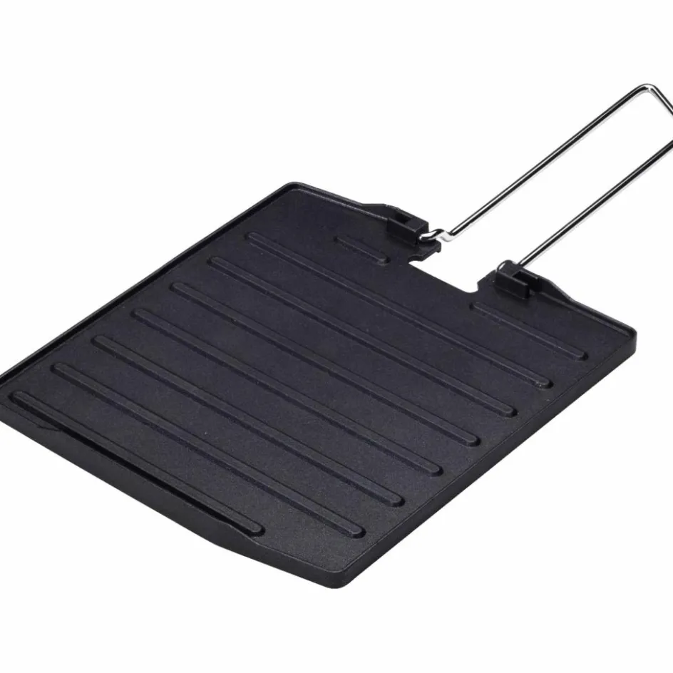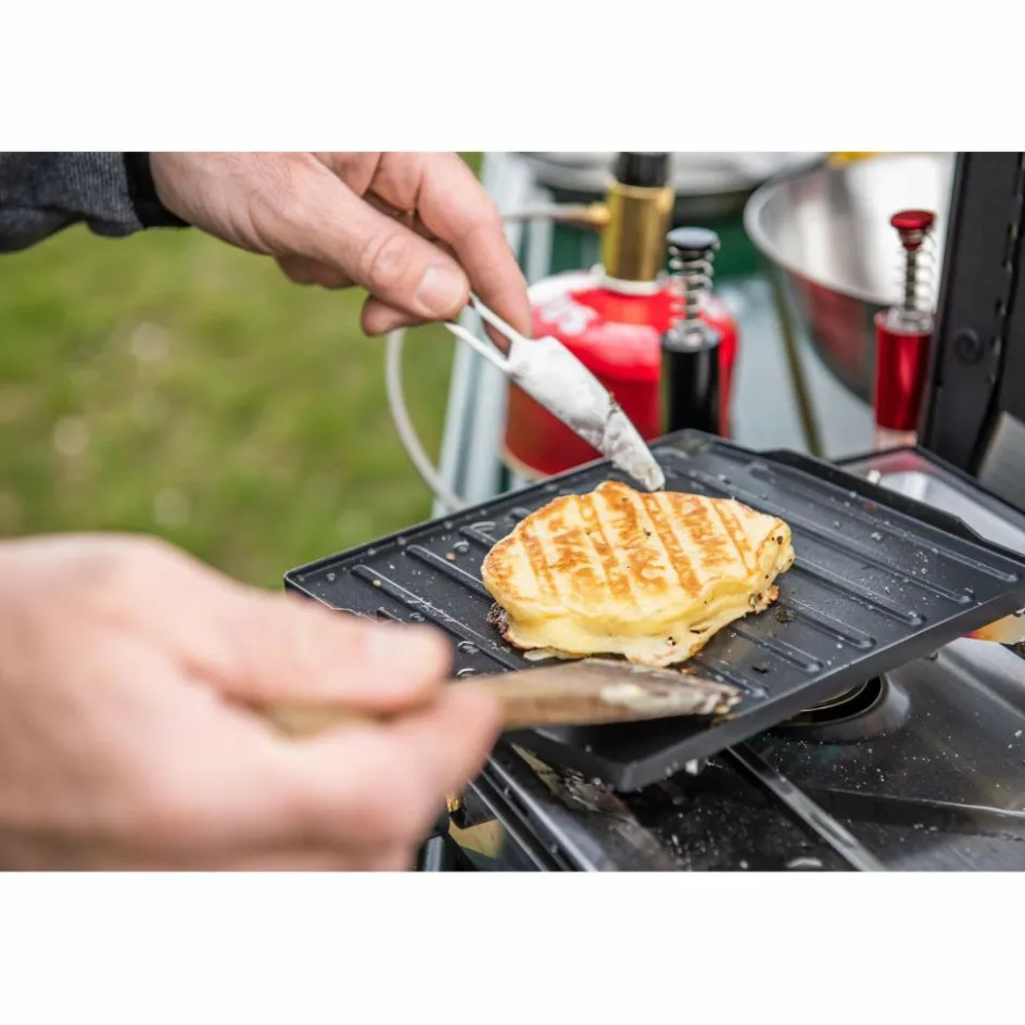 Diese Grillplatte mit Antihaftbeschichtung passt auf die Primus Gaskocher Tupike und Kinjia aber auch auf viele weitere Zweiflammkocher. Das Fett wird durch die Rinnen vom Grillgut weggeleitet.
