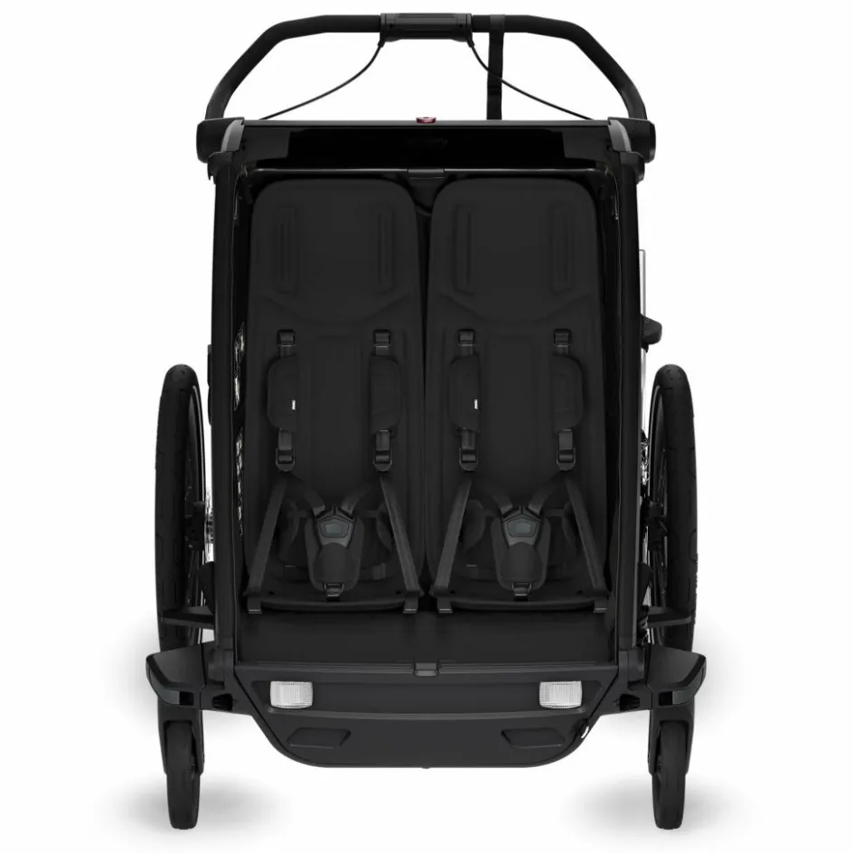 Was ihn von den anderen Thule Kindertransportern unterscheidet, ist vor allem die effektive, von Hand bedienbare Scheibenbremse, die den Chariot Sport 2 Double absolut geländetauglich macht, sowie der komfortable, gut ventilierte Innenraum mit Komfort-Sitzen. Zwei Lüftungsöffnungen unterhalb der Frontrückstrahler sorgen für den angenehmen Luftaustausch während der Fahrt.