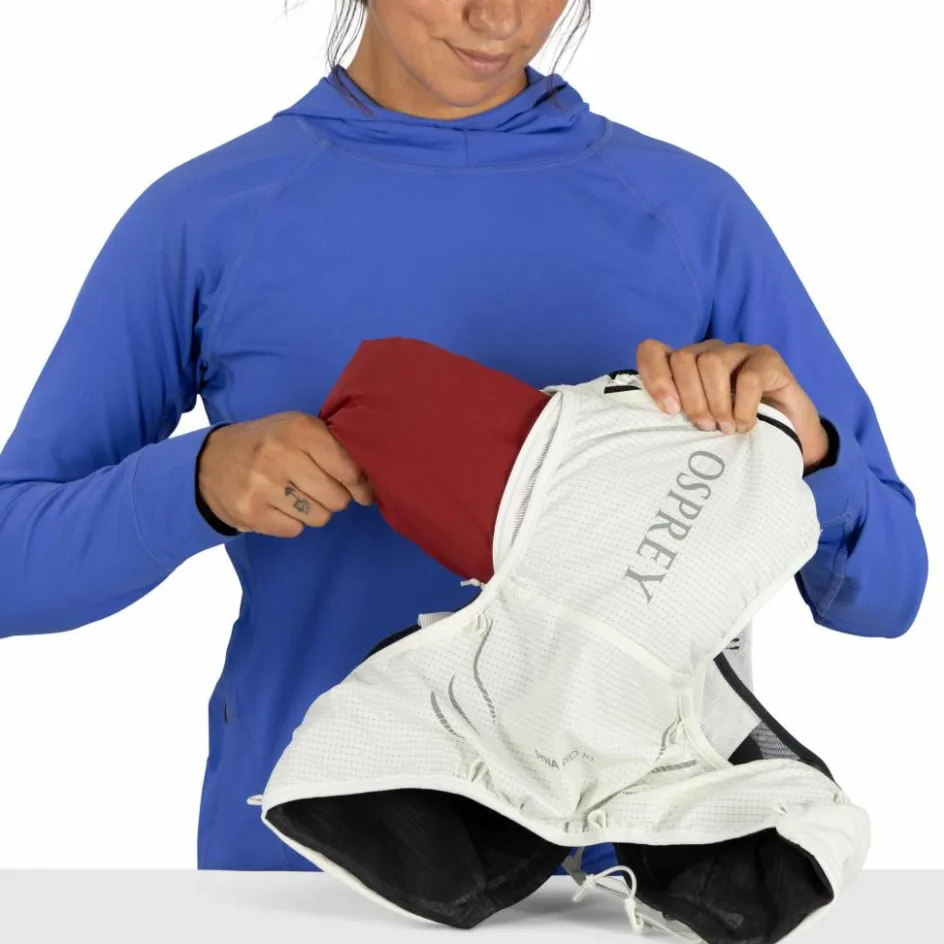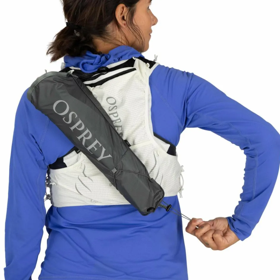 Zwei 500 ml Softflasks sorgen dafür, dass du stets mit Flüssigkeit versorgt bleibst. Für längere Durststrecken auf abgelegenen Trails lässt sich die Dyna 10 Pro zudem mit Ospreys Hydraulics LT 1.5 L Trinkblase (optional erhältlich) bestücken und das Trinkvolumen dadurch auf satte 2,5 L erweitern. Für Energieriegel oder die Stirnlampe gibt es mehrere Steckfächer und auch das Smartphone ist dank zweier RV-Fächer auf der Brust immer griffbereit. Deine Regenjacke kannst du zudem im elastischen Steckfach am Rücken unterbringen.
