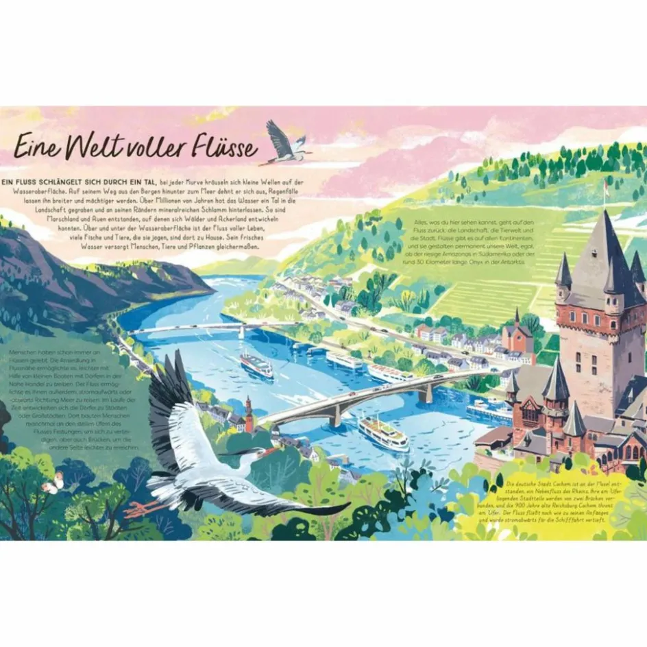 Zudem werden auf großformatigen Ausklappseiten die größten, bedeutsamsten und bekanntesten Wasserstraßen unserer sieben Kontinente vorgestellt. Komm mit zur Donau, zum Amazonas in Südamerika, an den Ganges, den Mississippi, zum Murray in Australien oder an die Ufer des Nils in Afrika. Ein üppig illustriertes Natursachbuch, vollgepackt mit wirklich allem, was es über Flüsse zu wissen gibt!