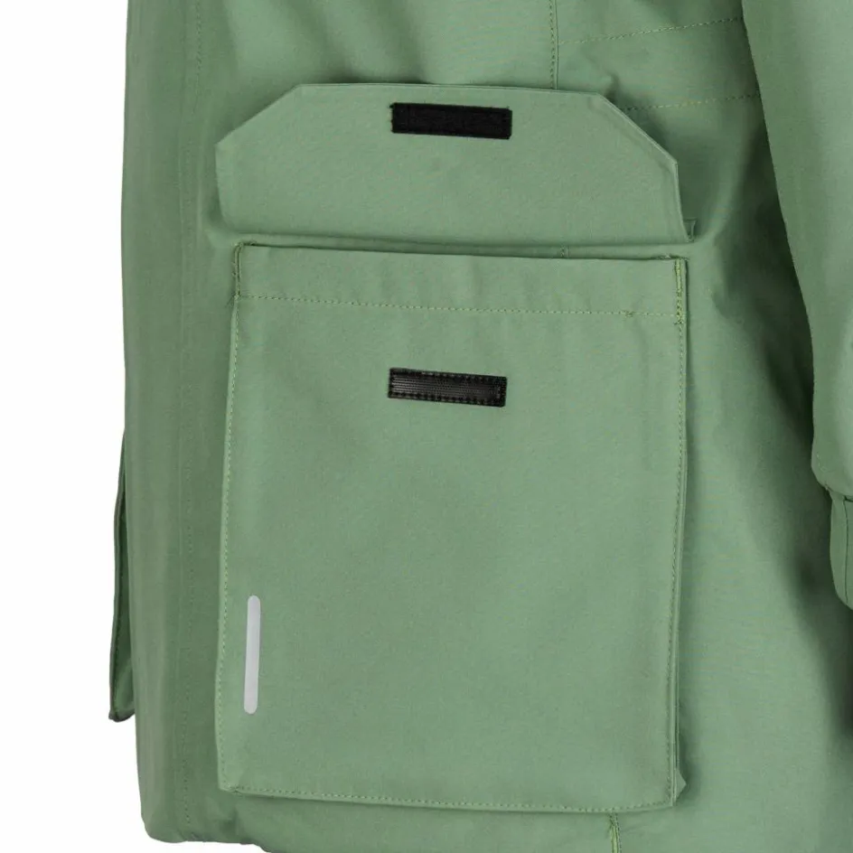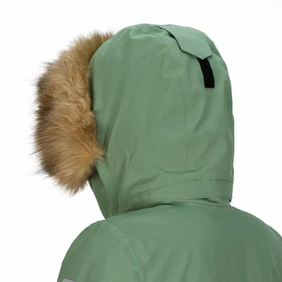 Die Kapuze ist abtrennbar und ist mit einem separat abnehmbaren Kunstpelz-Besatz ausgestattet. Der sieht nicht nur hübsch aus, sondern hält auch Schneeflocken vom Gesicht fern. Der etwas längere Schnitt sorgt für mehr Schutz, durch den Bewegungsschlitz hinten können sich die Kinder aber trotzdem frei bewegen. Die großen, aufgesetzten Fronttaschen bieten zusammen mit der Reißverschluss-Brusttasche viel Stauraum für Mützen, Handschuhe und liebgewonnene Fundstücke. Die Ärmelbündchen lassen sich per Klettverschluss so einstellen, dass sie gut abschließen und keine Nässe und Kälte eindringen kann. Ein Schnürzug auf Taillenhöhe ermöglicht es, die Weite der Jacke individuell anzupassen.