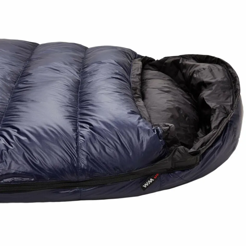 Western Mountaineerings Extremelite-Serie zeichnet sich durch ultraleichte Materialien aus. Das Außenmaterial aus 12D Ripstop Nylon ist daunendicht. Innen kommt 15D Nylon Taffeta zum Einsatz. Es ist herrlich weich und fühlt sich auch direkt auf der Haut angenehm an. Durch die schwarze Farbe heizt es sich schnell auf und trocknet dadurch beim Auslüften schneller.