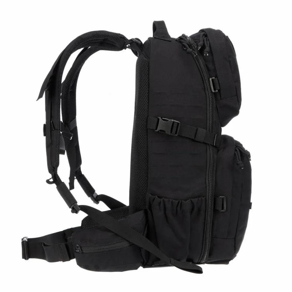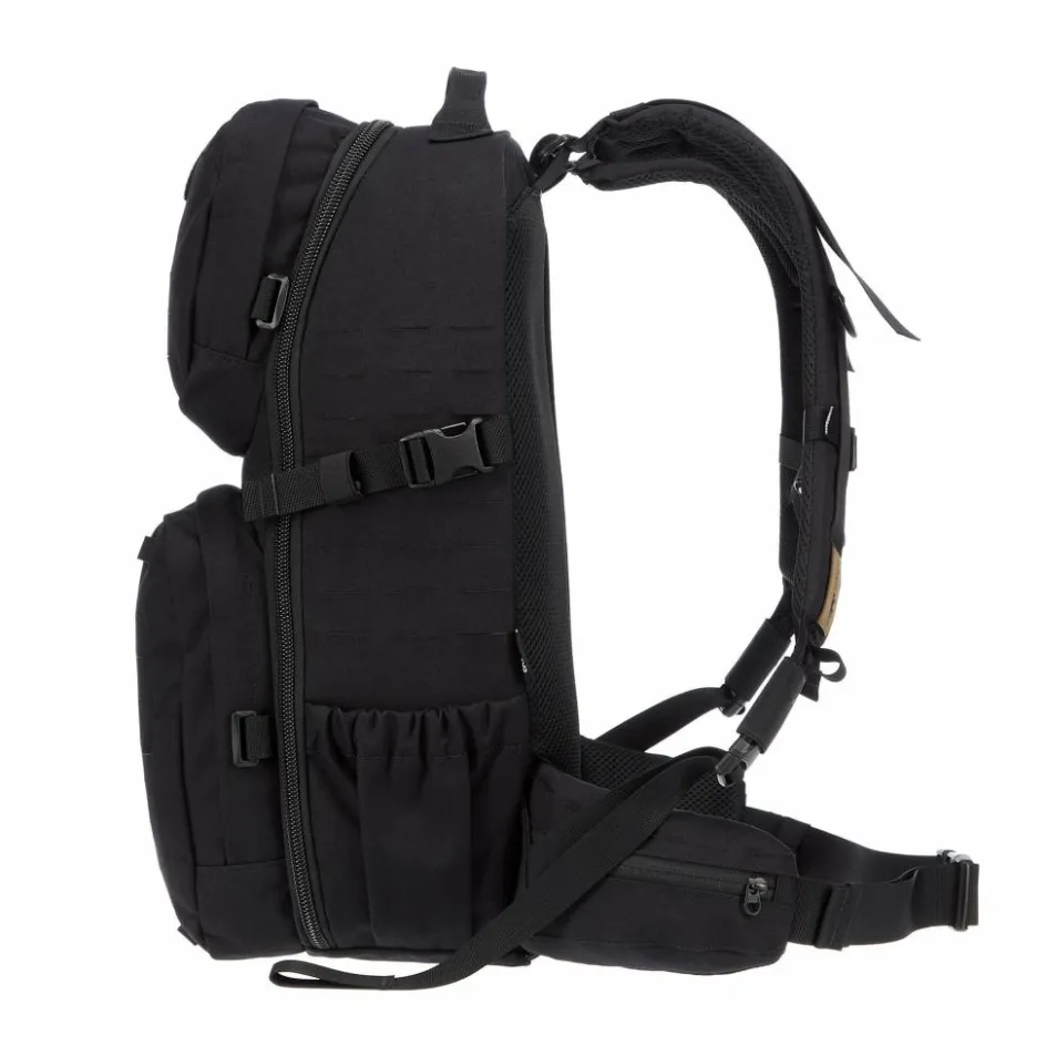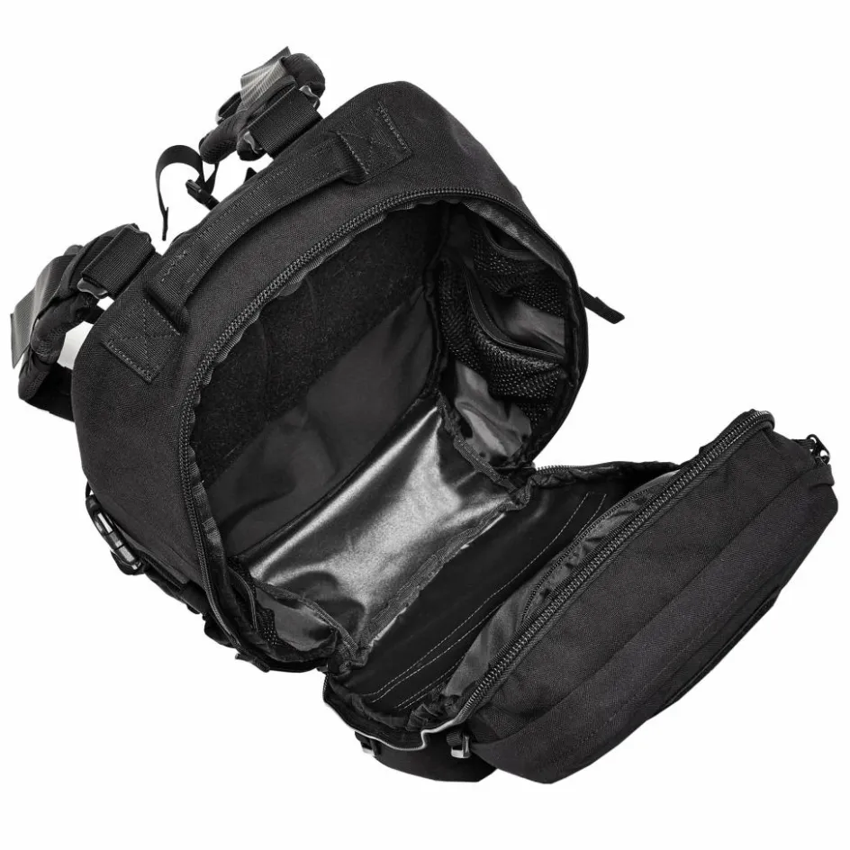 Hinzu kommen verschieden große Befestingsösen auf der Außenseite sowie zwei aufgesetzte Fächer. Der Rucksack kann dadurch mit anderen Gepäckstücken kombiniert und mit dem passenden MOLLE-Zubehör individualisiert werden.