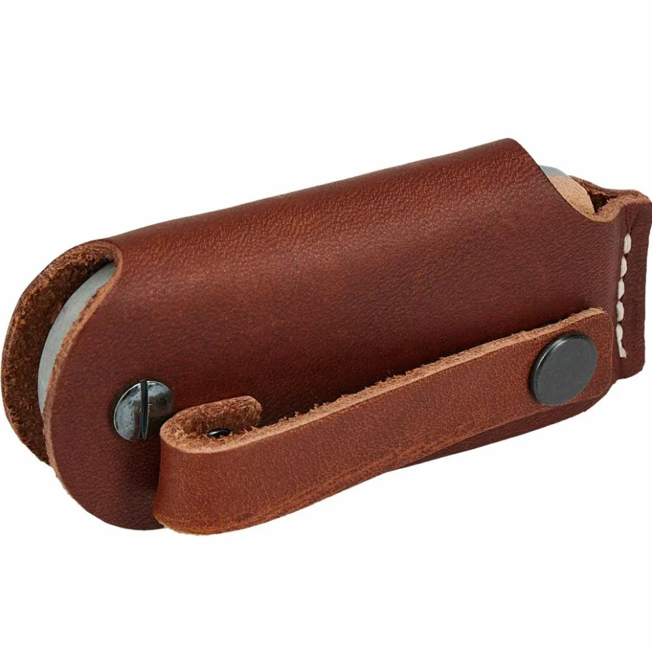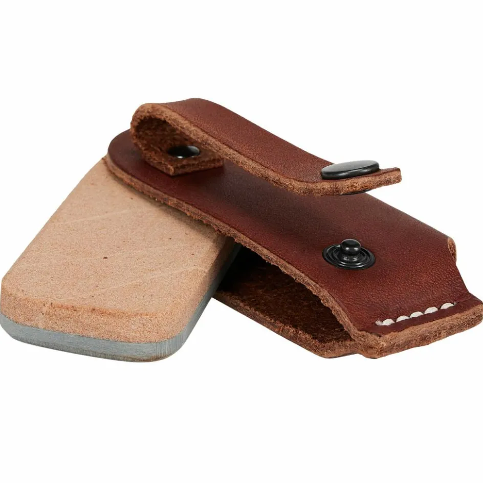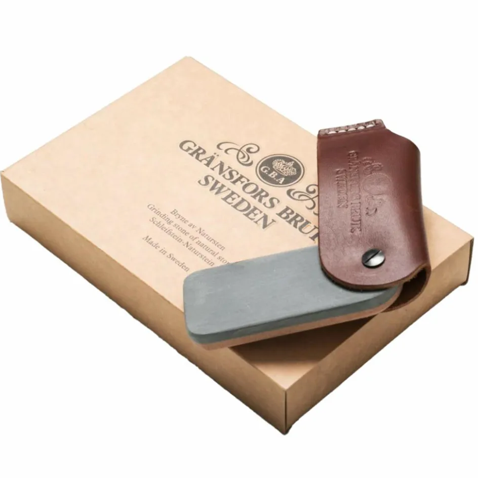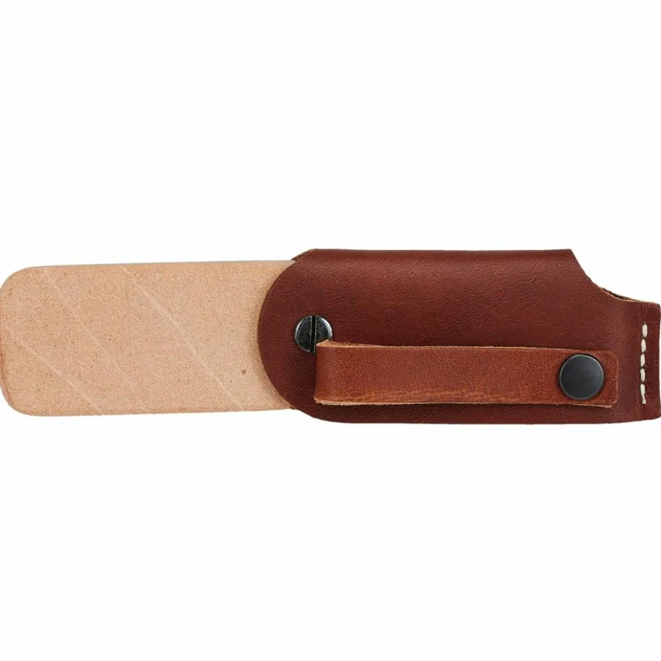 Der Schleifstein steckt in einer robusten Lederhülle, aus der du den Stein seitlich herausklappen kannst. Das pflanzlich gegerbte Leder aus Tärnsjö schützt den Naturwetzstein beim Transport und verfügt über eine Schlaufe auf der Rückseite, um ihn am Gürtel oder Rucksack zu befestigen.