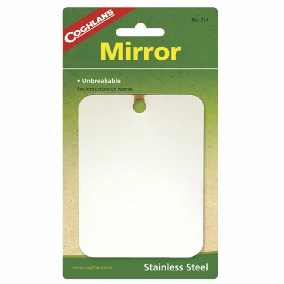 Der 11 x 8 cm große Spiegel besteht aus poliertem, rostfreiem Stahl und eignet sich hervorragend für Outdoortouren und lange Reisen, bei denen ein bruchfester Spiegel benötigt wird.