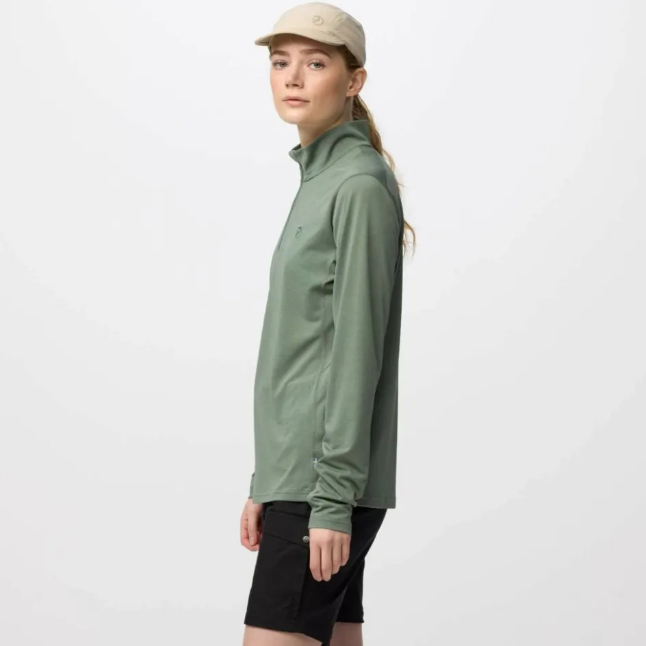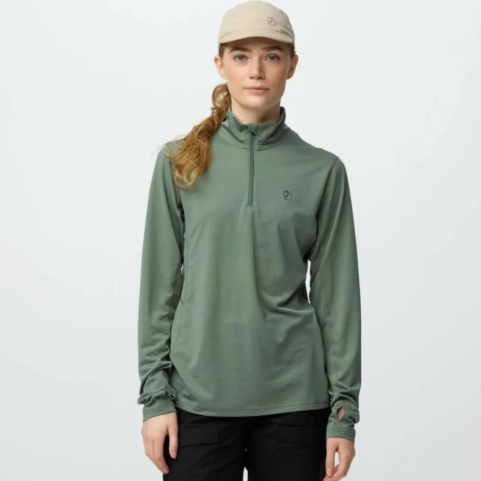 Vielseitiges Langarmshirt aus schnelltrocknendem Material; das Abisko Day Hike Half Zip W eignet sich beim warmem Wetter solo getragen und kann ansonsten auch im Lagensystem eingesetzt werden.