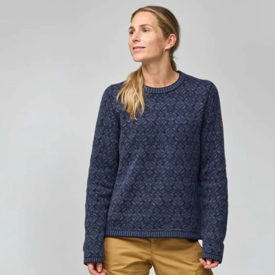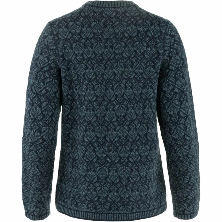 Das hübsche Muster ist von skandinavischer Folklore inspiriert. Rippstrick an Bund und Ärmeln sowie am Halsausschnitt runden den schönen Look ab. Die ansonsten flachen Nähte unterstreichen das gemütliche Tragegefühl. Auch das Fjällräven Fuchslogo aus Leder am Ärmel fehlt natürlich nicht.