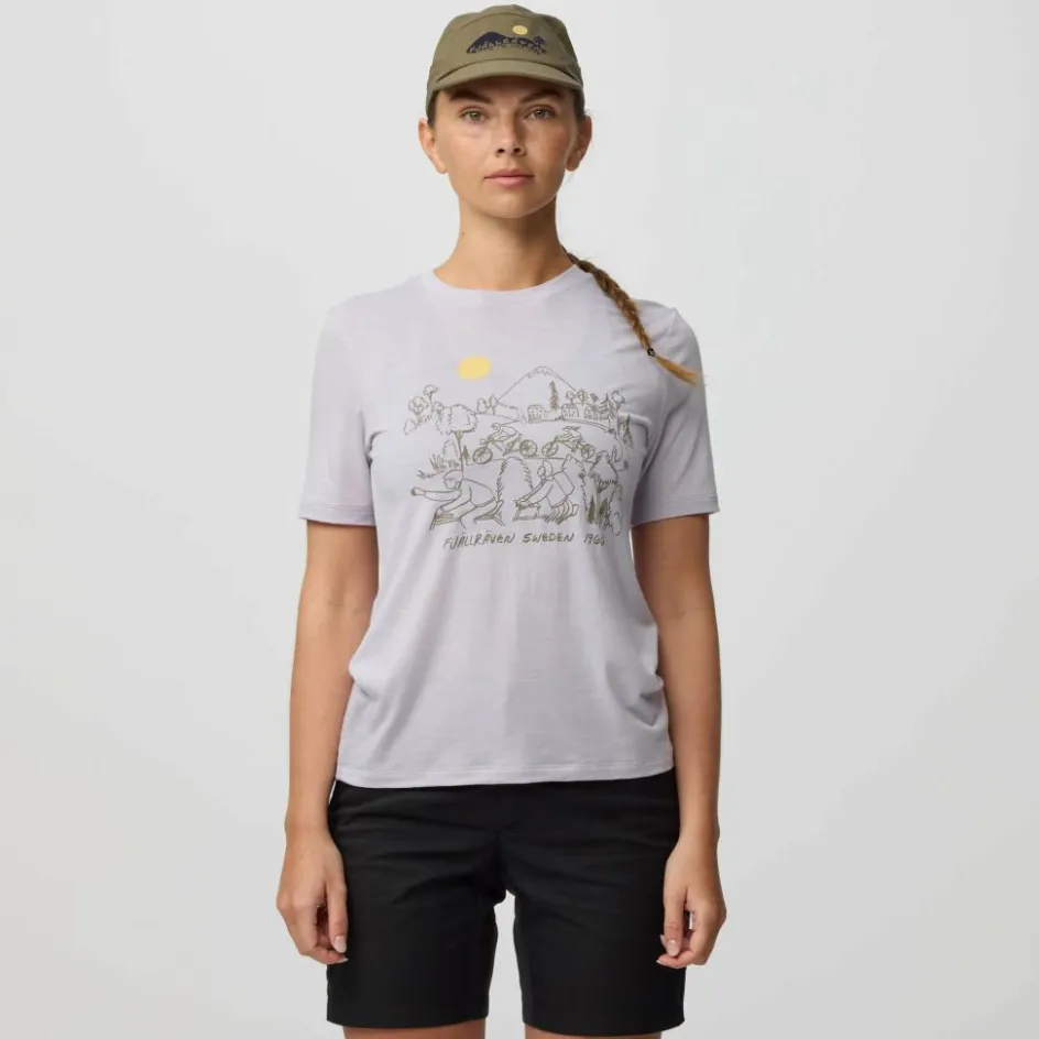 Mit Print und funktioneller Mischung: Das Hoja Lugnt Wool T-Shirt W ist aus einer Merinowoll-Polyester-Mischung und eignet sich dank der Materialeigenschaften prima für lange Tage im Sattel.