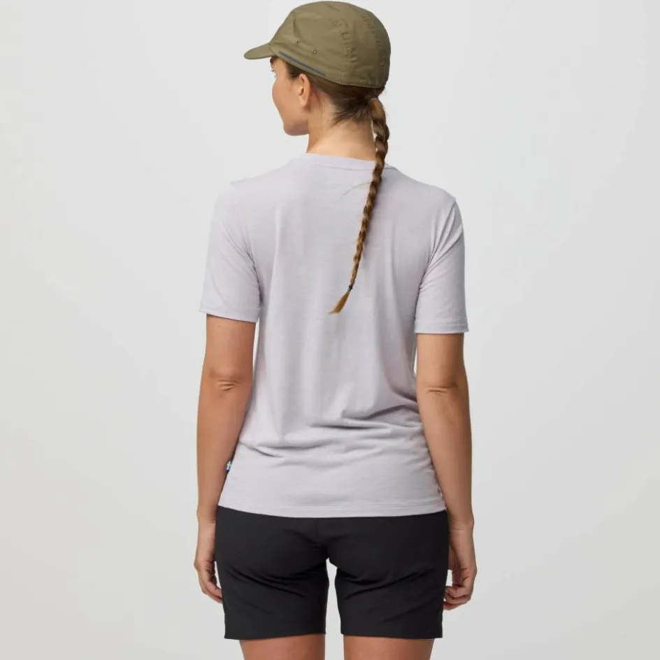 Ärmel und hinterer Saum sind für guten Sitz und Schutz länger geschnitten. Die Mischung beider Materialien im Hoja Lugnt Wool T-Shirt W eignet sich bestens für fordernde und lange Etappen, auch über mehrere Tage: Das Polyester wirkt feuchtigkeitsleitend und Gewebe-stabilisierend, die Wolle steuert geruchsmindernde und temperaturregulierende Fähigkeiten bei. Außerdem wärmt sie auch in feuchtem Zustand noch. Insgesamt hast du also ein angenehm weiches T-Shirt auf der Haut, das auch mal lückenhafte Pflege verzeiht und dir unterwegs ein gutes Klima beschert.