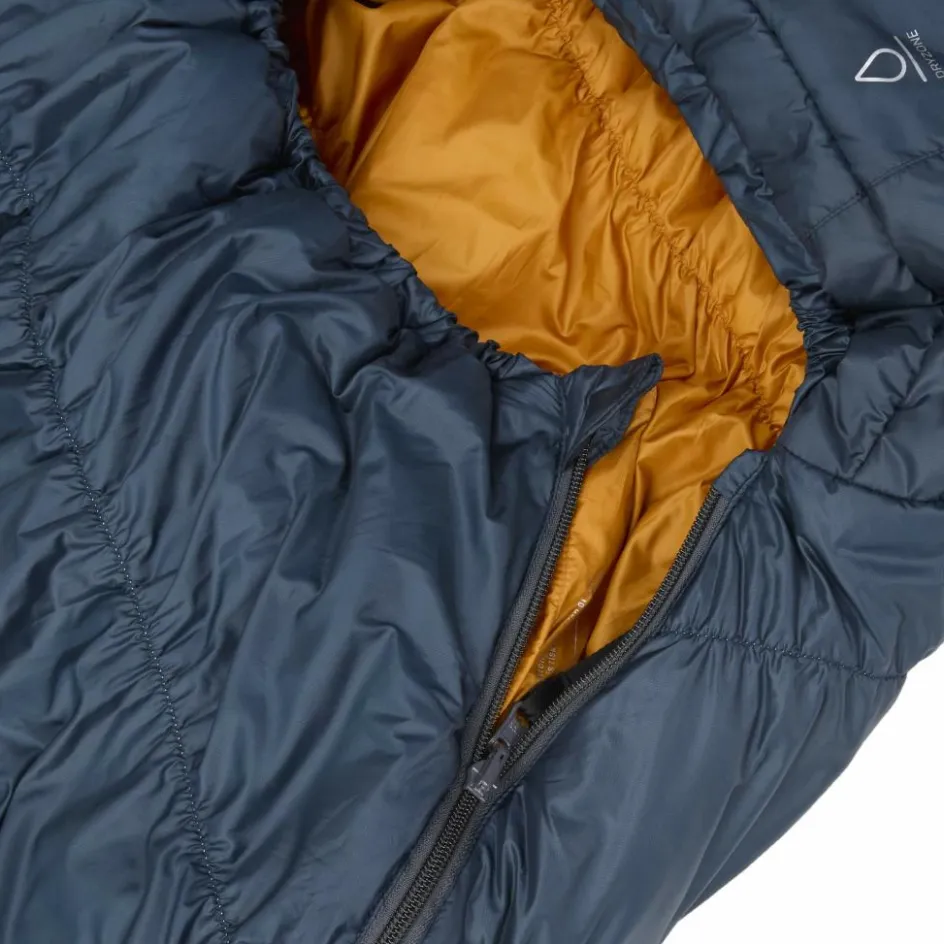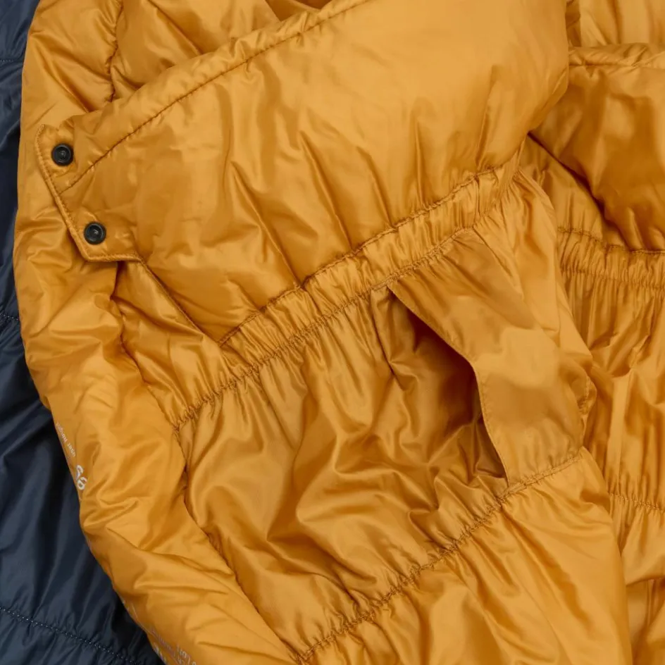 Oben und unten wird die gleiche Füllmenge verwendet. Durch diese 360-Grad-Füllung kannst du dich nachts auch auf die Seite oder den Bauch drehen, ohne dass du frierst. Die elastischen Nähte sorgen übrigens für eine schnellere Erwärmung des Schlafsacks, da der Körper weniger Luft erwärmen muss.