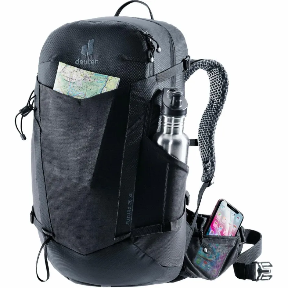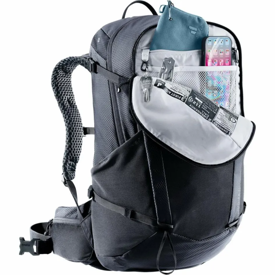 Die Raumaufteilung des Futura ist unverändert effizient geblieben. Deine Ausrüstung kannst du übersichtlich im Haupt- und Kopffach unterbringen. Die elastischen Netzfächer auf der Front und den Seiten eignen sich perfekt für Dinge, die du schnell zur Hand haben möchtest, zum Beispiel eine Regenjacke oder Trinkflasche. Für die Energieversorgung unterwegs musst du den Rucksack übrigens nicht abnehmen: RV-Taschen auf den Hüftflossen bieten unkomplizierten Zugriff auf Snacks oder Riegel. Eine Trinksystemaufnahme ermöglicht zudem die Verwendung einer Trinkblase (optional erhältlich).