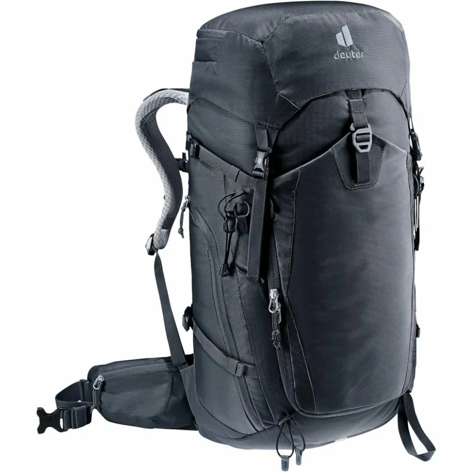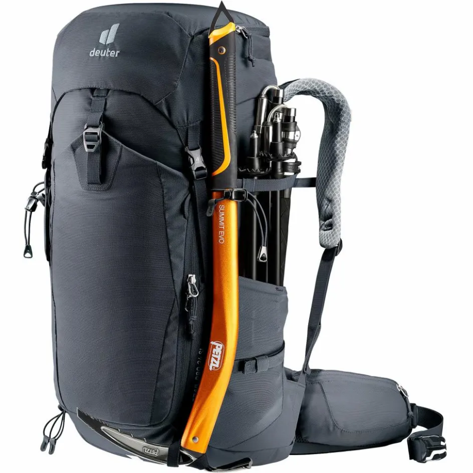 Das Airstripes Rückensystem mit geringer Auflagefläche und luftdurchlässigem, schnell trocknendem Air Spacer Mesh sorgt zusammen mit den perforierten Schulterträgern und Hüftflossen für maximale Belüftung, gute Lastverteilung und kompakten Sitz auf Mehrtagestouren mit Klettersteig. Dank Fixierungen an den Schulterträgern sind die Karabiner des Klettersteigsets stets griffbereit und das Material durch den großen Reißverschluss-Hauptfachzugang, die elastischen Seitentaschen und das separate Bodenfach gut sortiert und schnell verräumt.