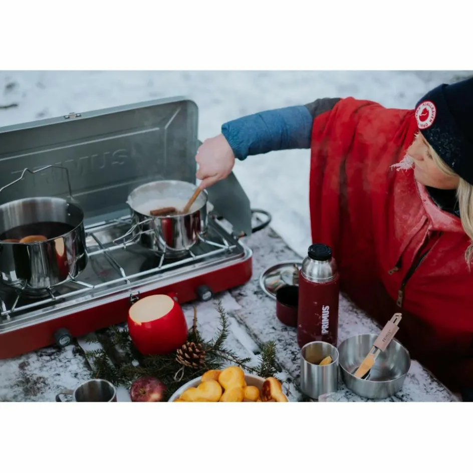Die zwei Flammen werden per Piezo-Zündung entzündet und sind separat regulierbar. Auf der Kochstelle ist genügend Platz für große Töpfe und Pfannen. Der Deckel und die Seitenteile ergeben einen effektiven Windschutz und schützt gleichzeitig vor Fettspritzern beim Braten. So kann die ganze Familie bekocht werden und einem anspruchsvollen Menü steht nichts im Wege.
