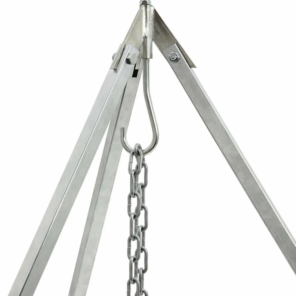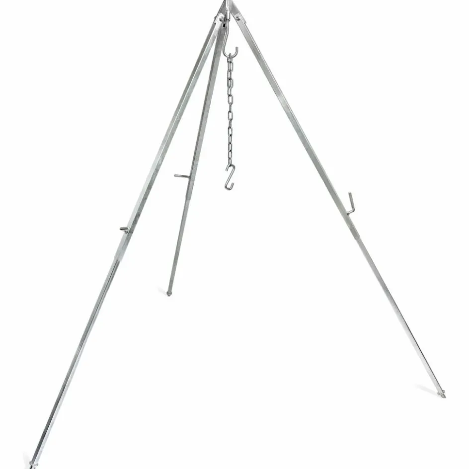 Hergestellt aus verzinktem Stahl, ist dieses stabile Dreibein auch für den regelmäßigen Gebrauch geeignet. Die Höhe der Beine kann stufenlos von 88 bis 144 cm verstellt werden. In der Mitte wird der Topf am Haken aufgehängt und kann durch die Kette in der Höhe verstellt werden.
