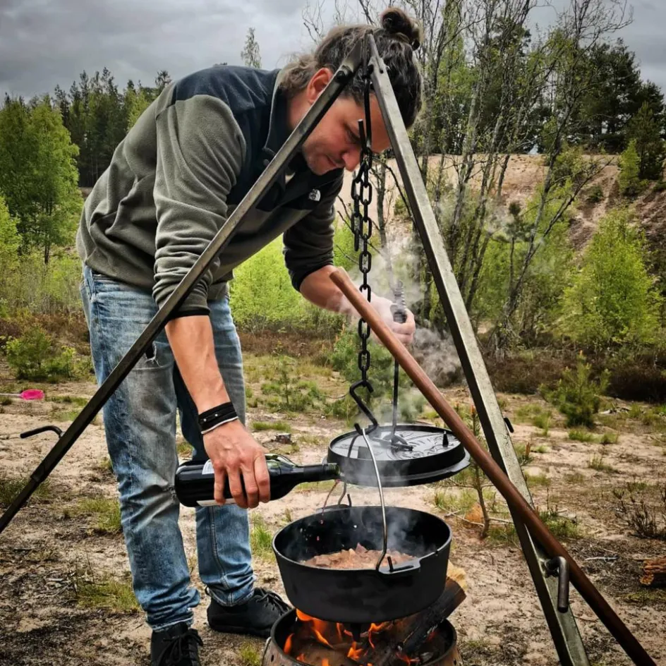 Dieses Dreibein eignet sich zum Kochen über der Feuerschale und trägt selbst schwere Gulaschtöpfe und Dutch Ovens bis zu 40 kg. Die Höhe ist durch teleskopierbare Beine und eine Kette verstellbar.