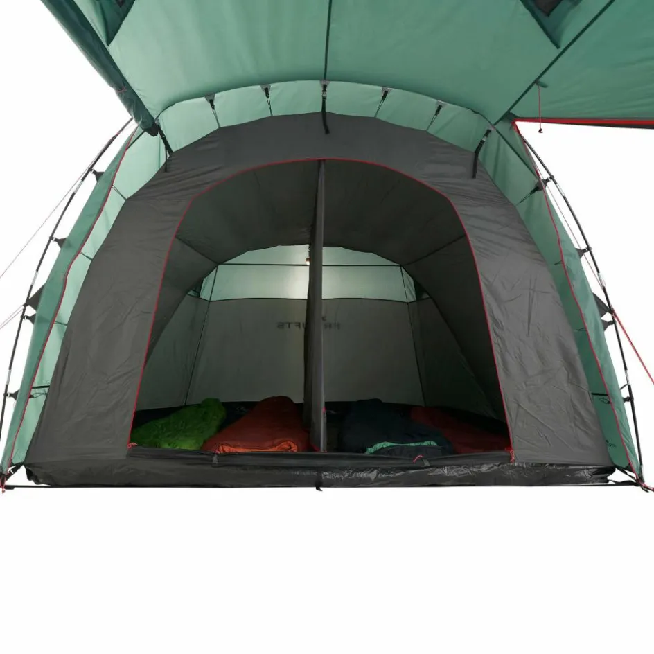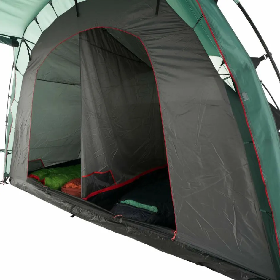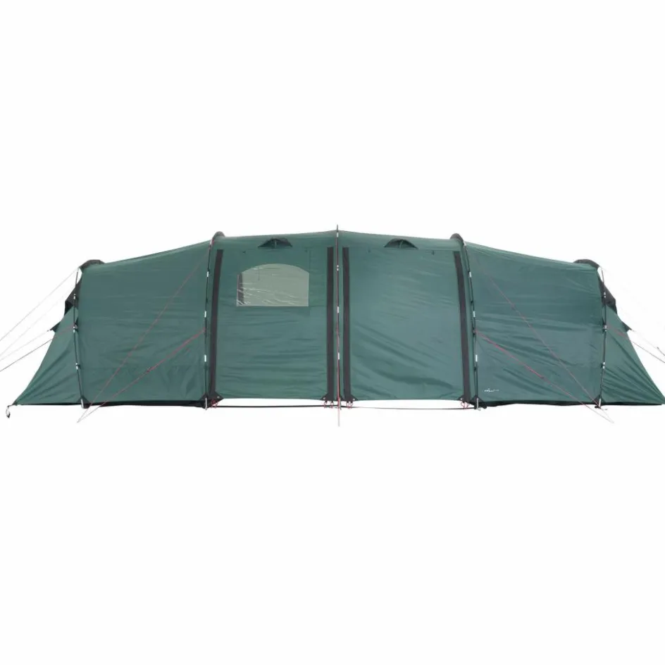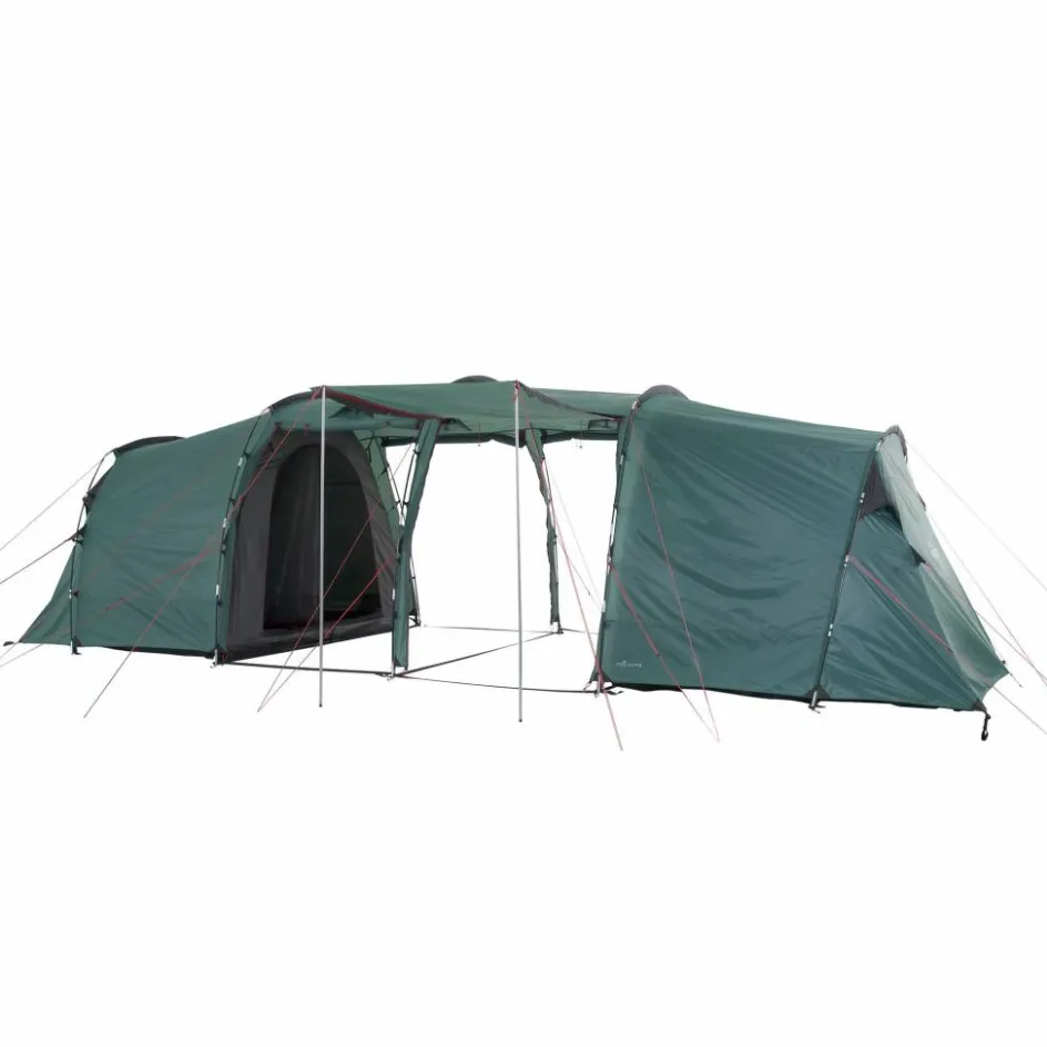 Werden beide Innenzelte ausgehängt, kann das verbleibende Überzelt als Zelt für z. B. Gartenpartys dienen. Vier Eingänge, die teilweise hochgestellt werden können, bieten nicht nur eine gute Aussicht, sondern mit den acht weiteren Lüftern auch eine optimale Raumbelüftung. Die Fenster stellen jedoch auch bei geschlossenen Eingängen eine gute Sicht nach draußen bereit.
