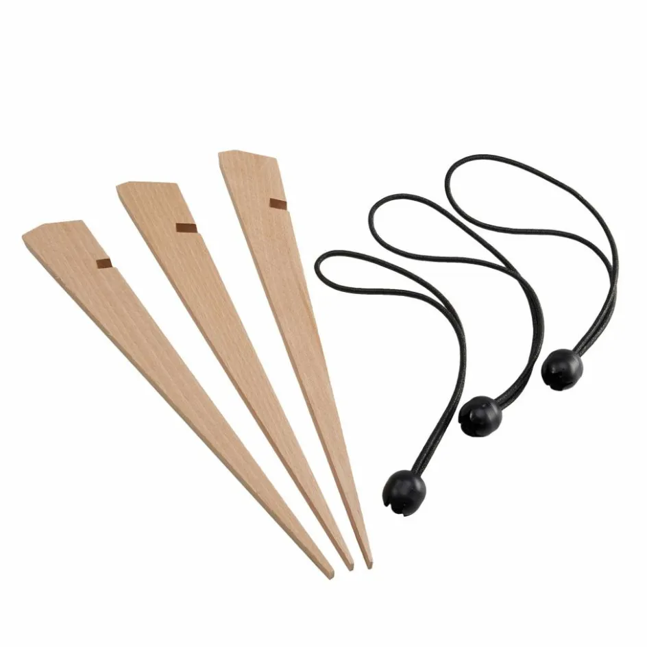 Die elastischen Bänder federn Windböen ab und eignen sich auch, um mehrere Tarpstangen für den Transport zusammenzuhalten. Die Holzheringe werden in Europa gefertigt und stammen aus nachhaltiger Forstwirtschaft.