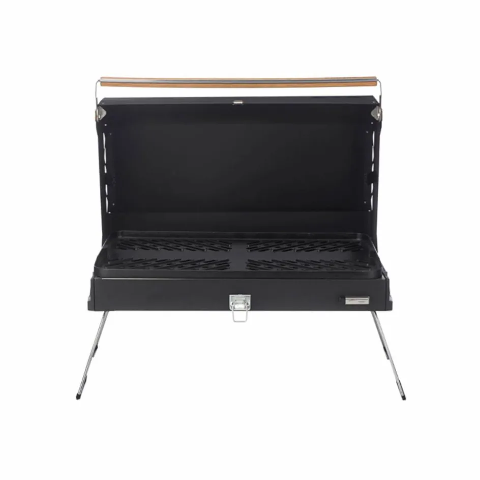 Der Kuchoma ist im Packmaß sehr kompakt, damit du ihn gut verstauen und transportieren kannst. Aufgebaut hast du aber einen vollwertigen Grill vor dir stehen. Die ausgeklappten Beine bieten eine große Standfläche, damit der Grill auch im Sand oder auf einer Wiese sicher steht. Das Grillrost ist antihaftbeschichtet und so konstruiert, dass kein Grillsaft in die Flamme tropfen kann, sondern in einer darunterliegenden Schale aufgefangen wird. Alle Teile lassen sich nach dem Grillen gut reinigen.