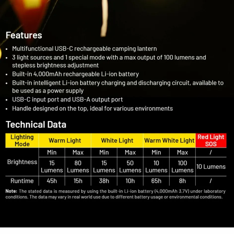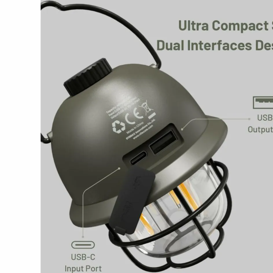 Das robuste Gehäuse aus ABS Kunststoff und gehärtetem Metallkäfig steckt ach Unachtsamkeiten gut weg und bringt dennoch nur 222 g auf die Waage. Unter der Abdeckung auf dem Lampenschirm versteckt sich der USB-C-Anschluss, über den du die Lampe innerhalb von 4 Std. aufladen kannst und ein USB-A-Anschluss, mit dem du Kleingeräte mit Strom versorgen kannst.