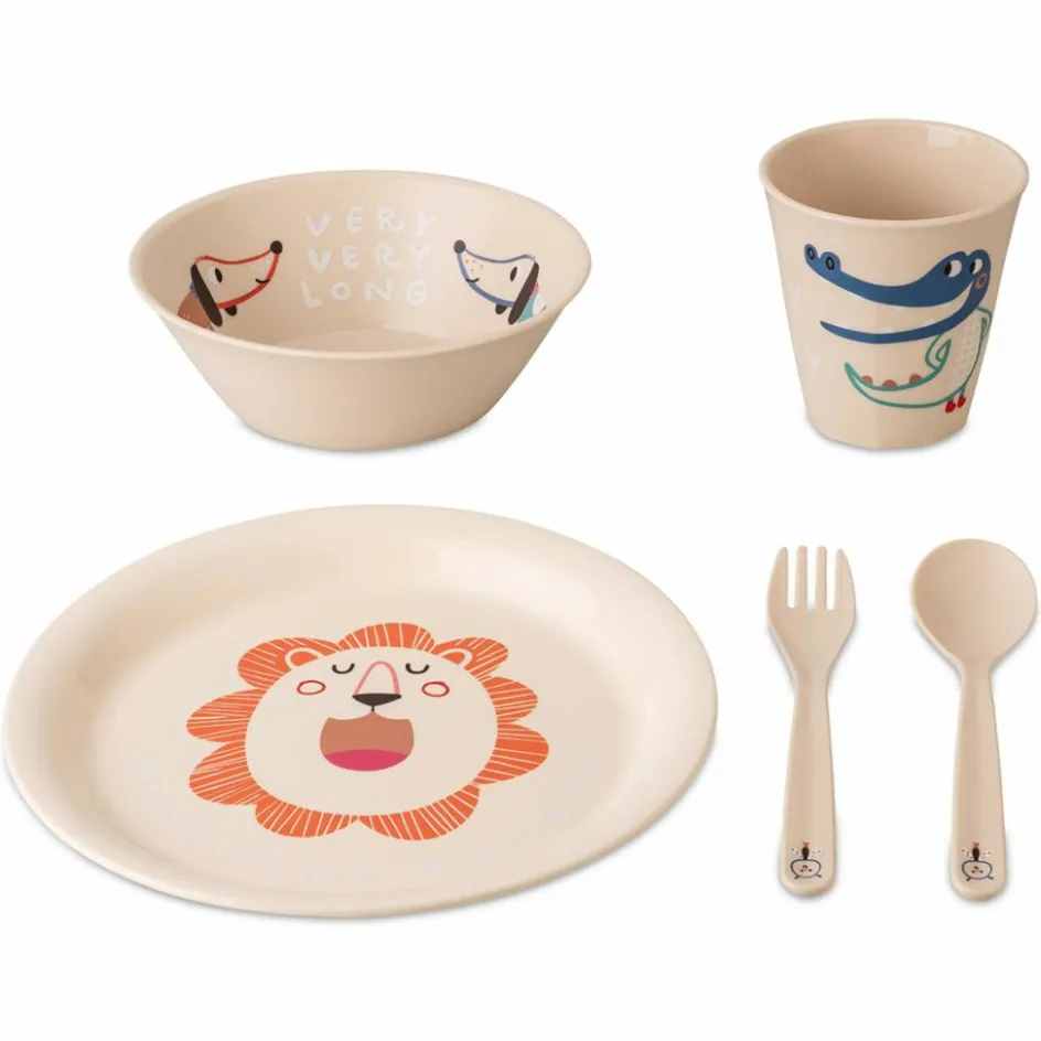 Dieses liebevoll verzierte, fünfteilige Geschirrset umfasst Teller, Becher, Müslischale, Löffel und Gabel. Es besteht aus bruchsicherem Kunststoff und wird in Deutschland hergestellt.