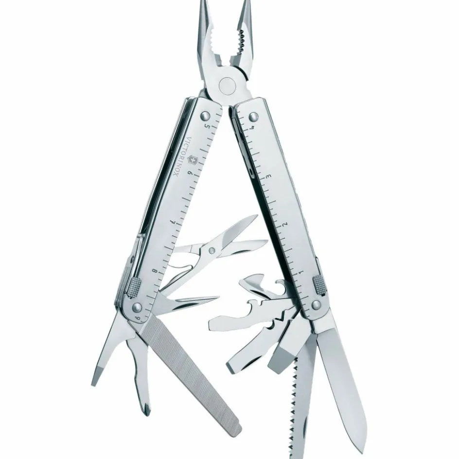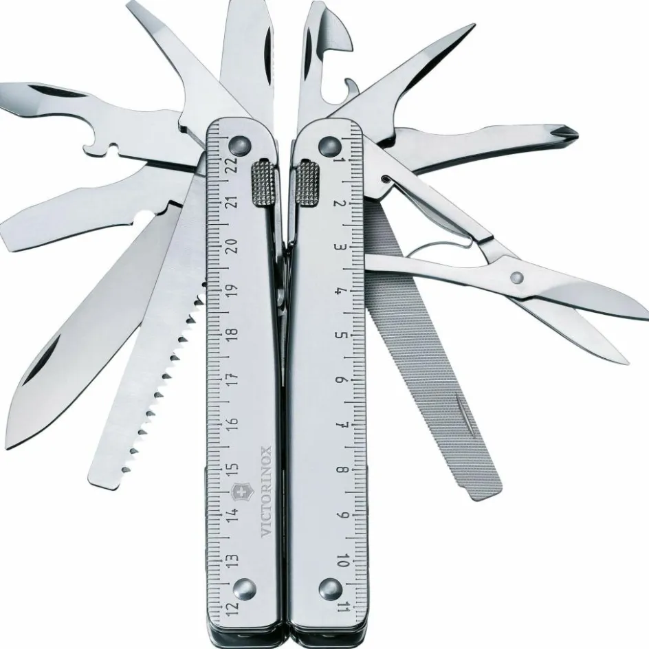 Das Swiss Tool X Plus Ratchet ist das größte und vielseitigste Multitool von Victorinox. Zum Lieferumfang gehört neben dem Tool auch ein Bit-Set mit Ratsche und ein Lederetui für alle Teile.