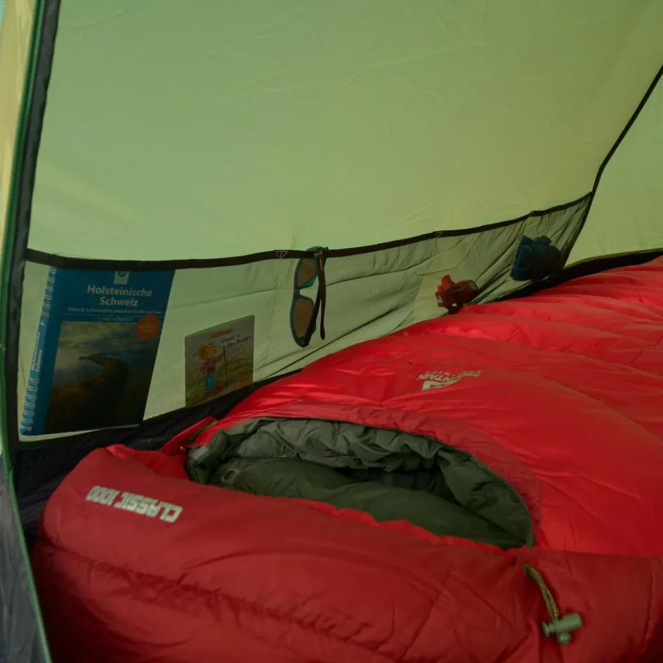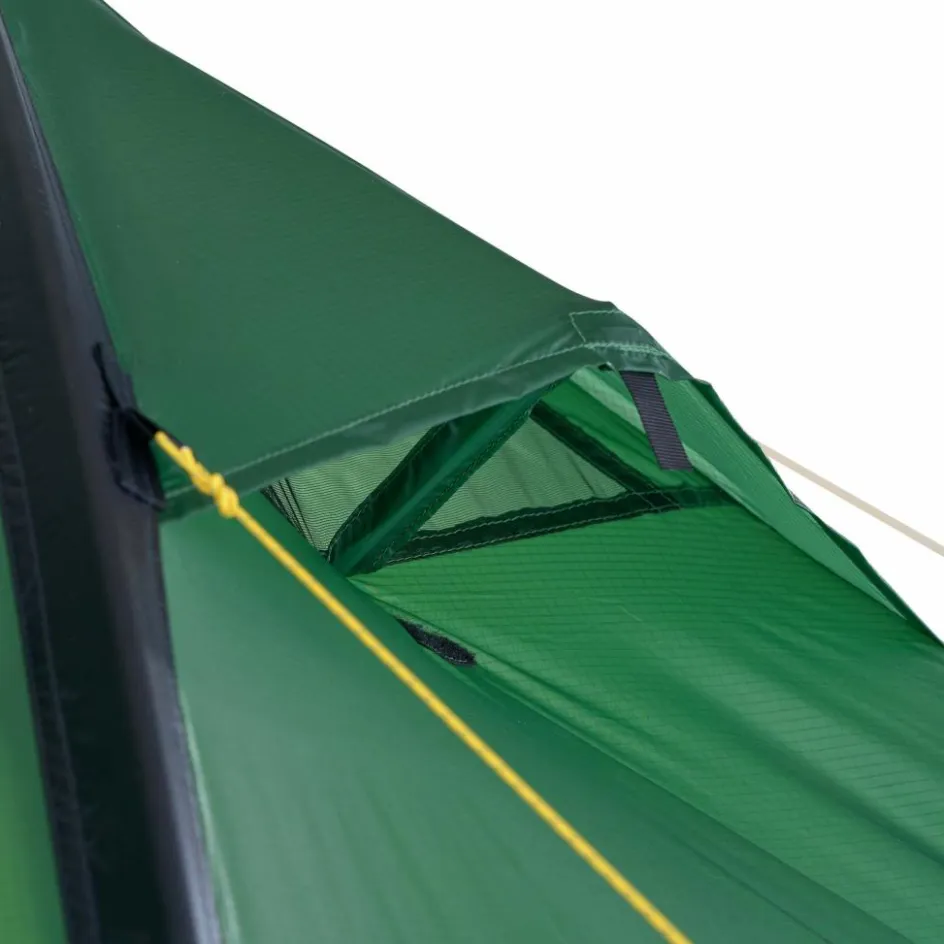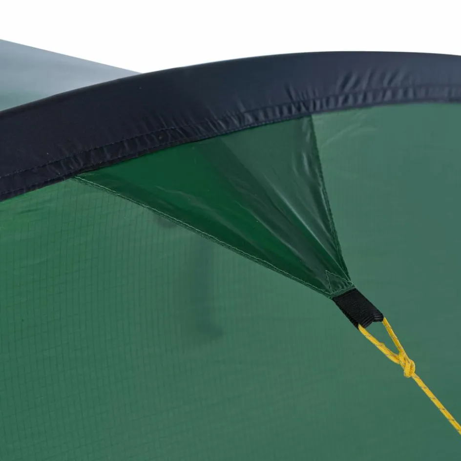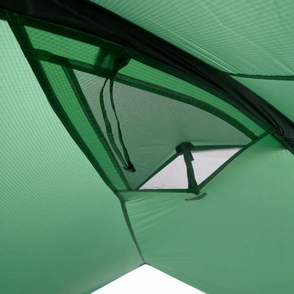 Das Zelt kannst du zu zwei Seiten betreten. Rucksäcke, Taschen und andere Ausrüstungsgegenstände finden ihren Platz in der großzügig geschnittenen Apsis. Ist es besonders warm, kannst du die Apsis bis zum ersten Gestängebogen aufrollen und für maximalen Luftaustausch sorgen. Vier seitliche Lüfter garantieren beste Belüftung bei schlechtem Wetter.