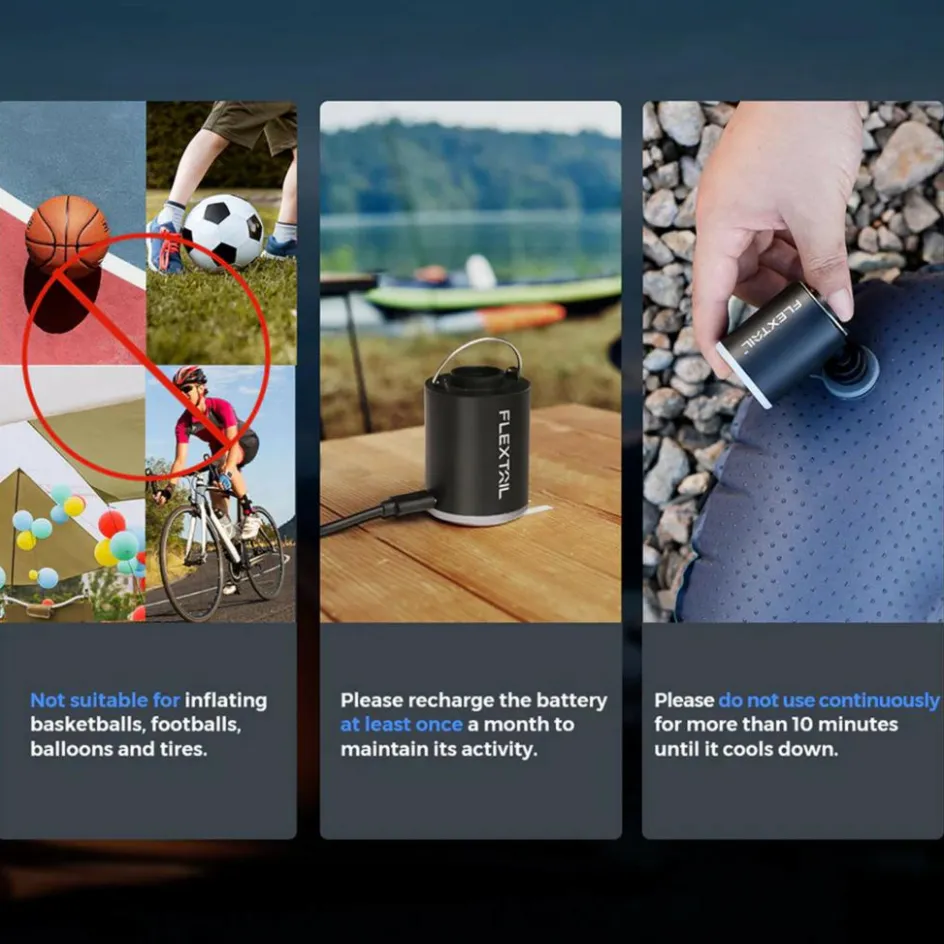 Mit der Tiny Pump X erreichst du eine Pumpleistung von 180 Litern pro Minute. Genug, um eine Therm-a-Rest NeoAir Matte in rund einer Minute vollständig mit Luft zu befüllen. Dank einer Laufzeit von etwa 20 Minuten pro Akkuladung kannst du sie auf einem zweiwöchigen Urlaub nutzen, ohne den Akku nachladen zu müssen.