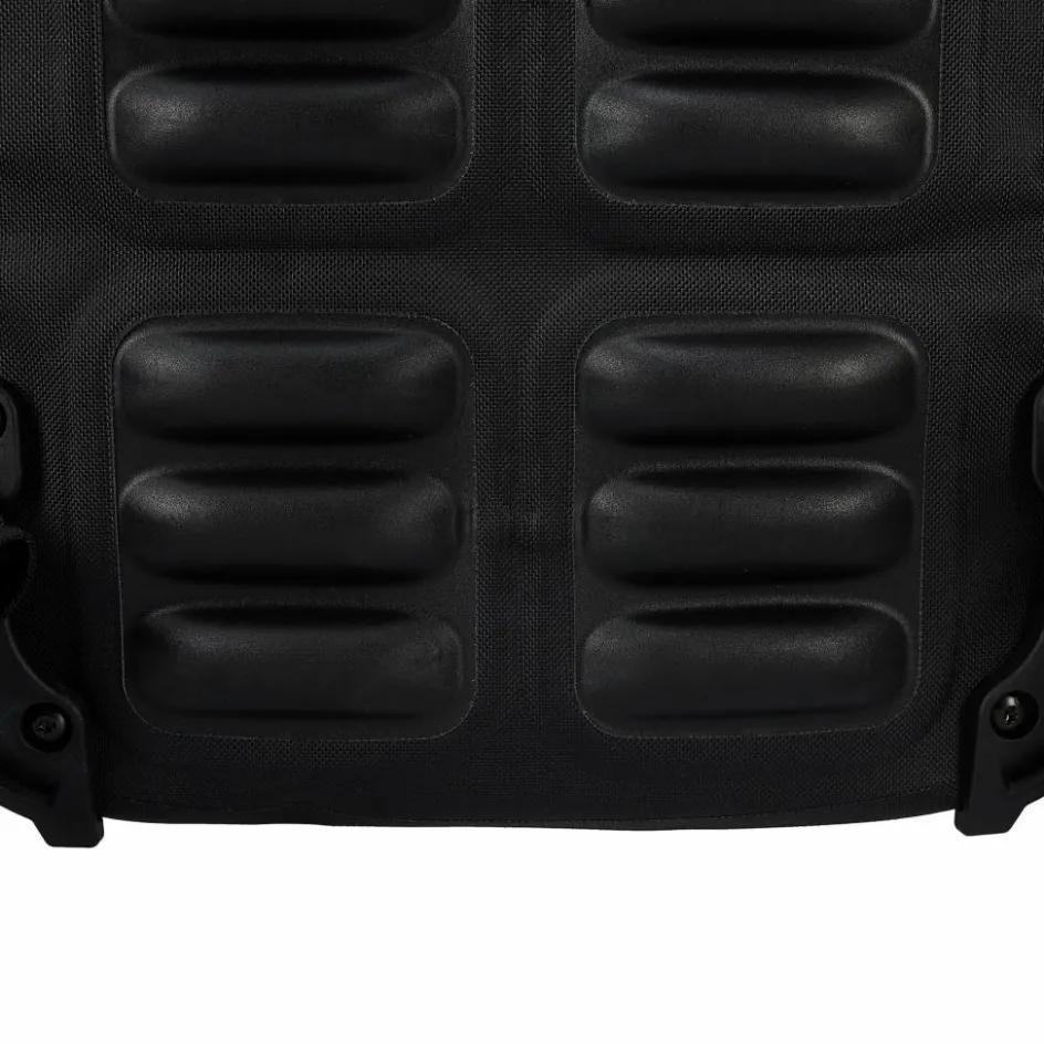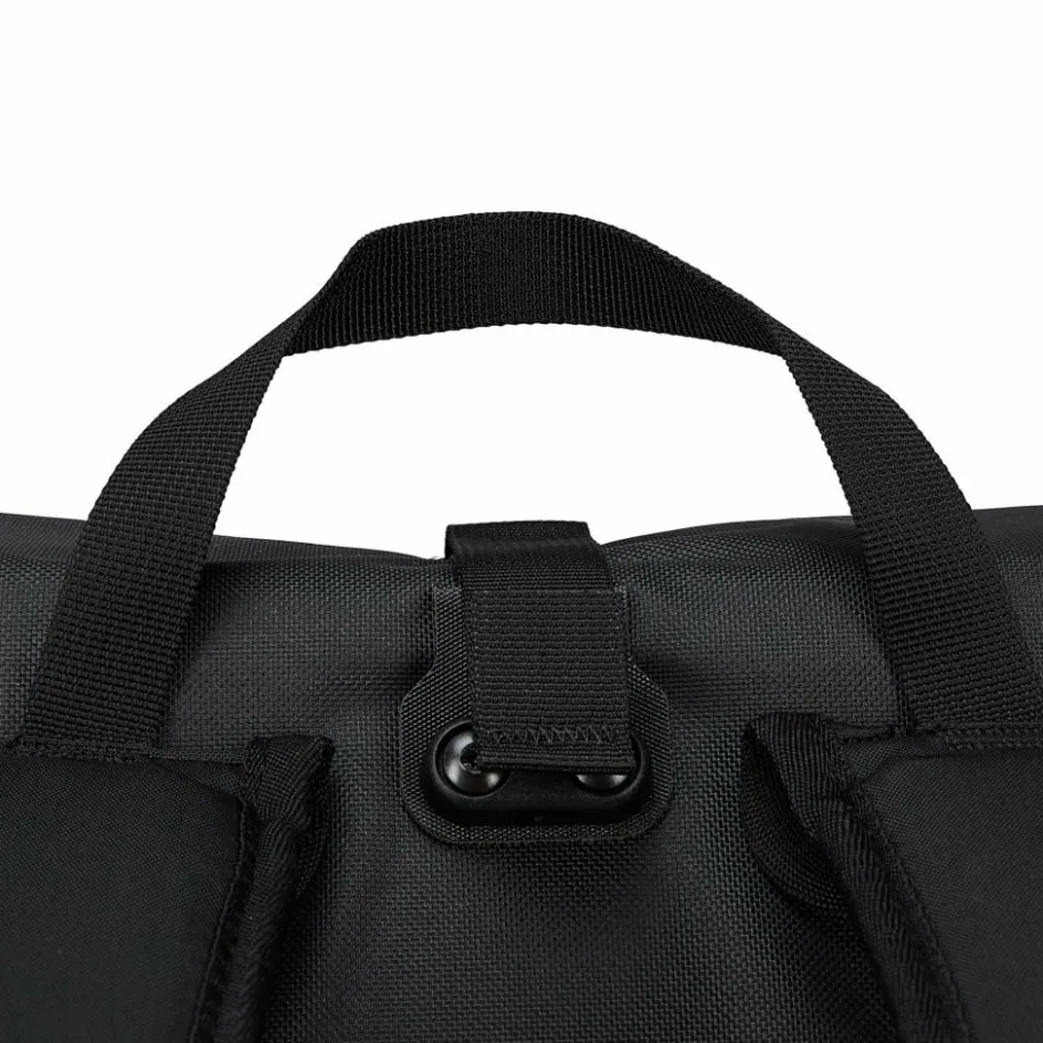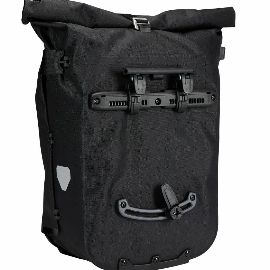 Aufhängung für Gepäckträger mit einem Rohrdurchmesser von 8 bis 16 mm. Die beiden oberen Haken lassen sich werkzeugfrei auf der aus einem Stück gefertigten Schiene verschieben und durch Anheben des Tragegriffs öffnen. Der untere Arretierungshaken ist ebenfalls auf einer halbelliptischen Schiene individuell anpassbar und werkzeugfrei in 15-Grad-Schritten drehbar. Ein Scheuerschutz im unteren Bereich der Taschen und an der Auflagefläche des Gepäckträgers beugt Abrieb vor.