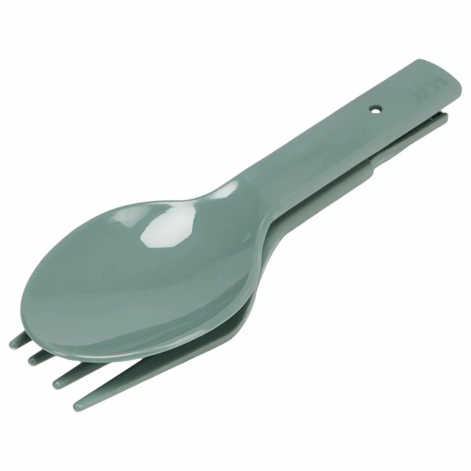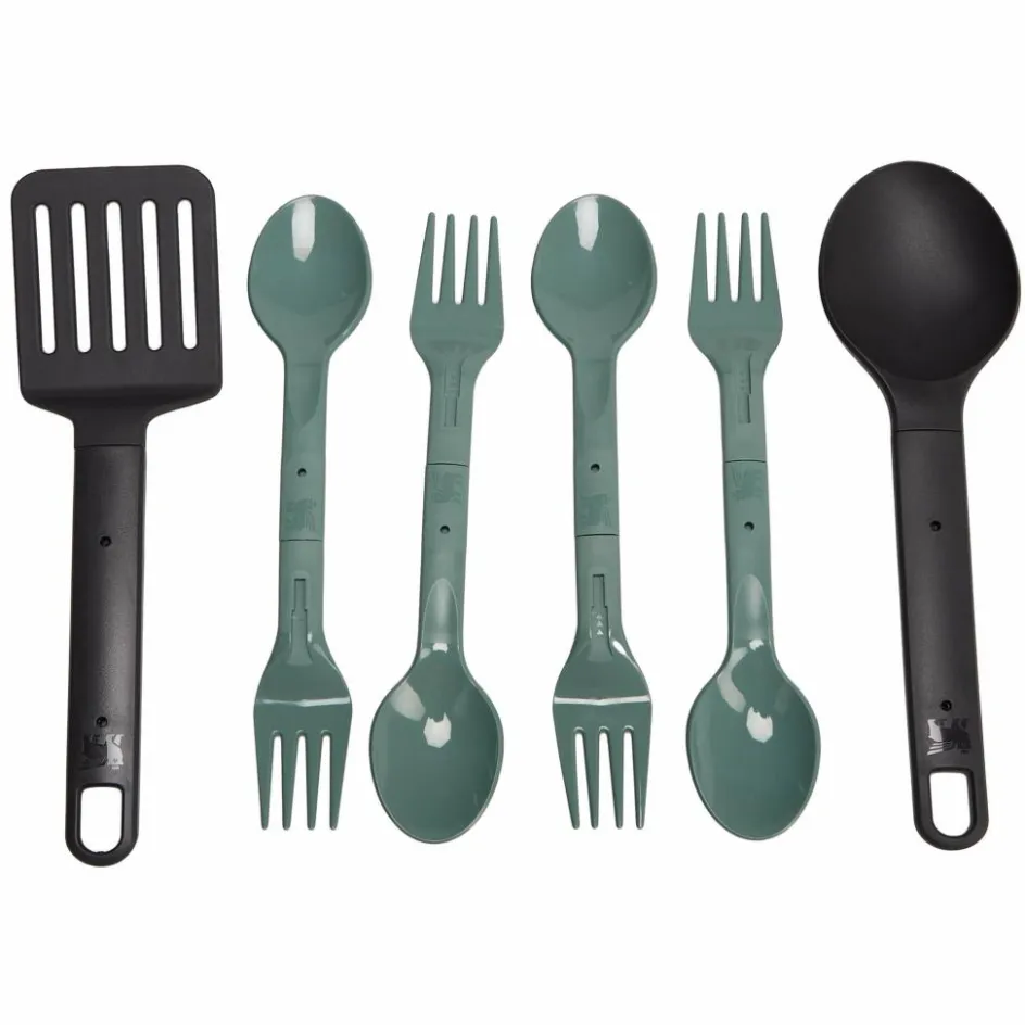 Neben Topf und Pfanne beinhaltet das Set weitere Kochutensilien (Pfannenwender, Kochlöffel und Besteck) und ein rutschfestes Schneidebrett mit abnehmbarem Untersetzer. Das Geschirrset für vier Personen umfasst hohe Teller und stapelbare Schüsseln für ein gemütliches Essen im Freien mit der ganzen Familie.
