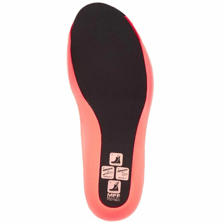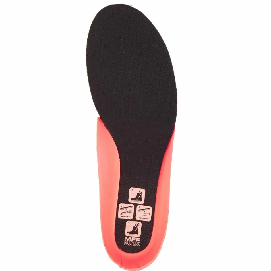 Kommen wir jetzt zur Passform. Hier kommt das neuartige Multi-Fit Foodbed zum Einsatz (siehe Detailbilder). Was konkret bedeutet, dass du mit nur wenigen Handgriffen selbst die Passform ändern kannst. Dafür musst du das schwarze Teil der dreiteiligen Einlegesohle mittels Klettverschluss auf einem der beiden orangen Teile befestigen. Wenn du das kleinere „Fersenteil“ verwendest, erhältst du eine normale bis eher breite Passform. Wenn die andere Verwendung findet, erhältst du einen schmalen Zustiegsschuh.